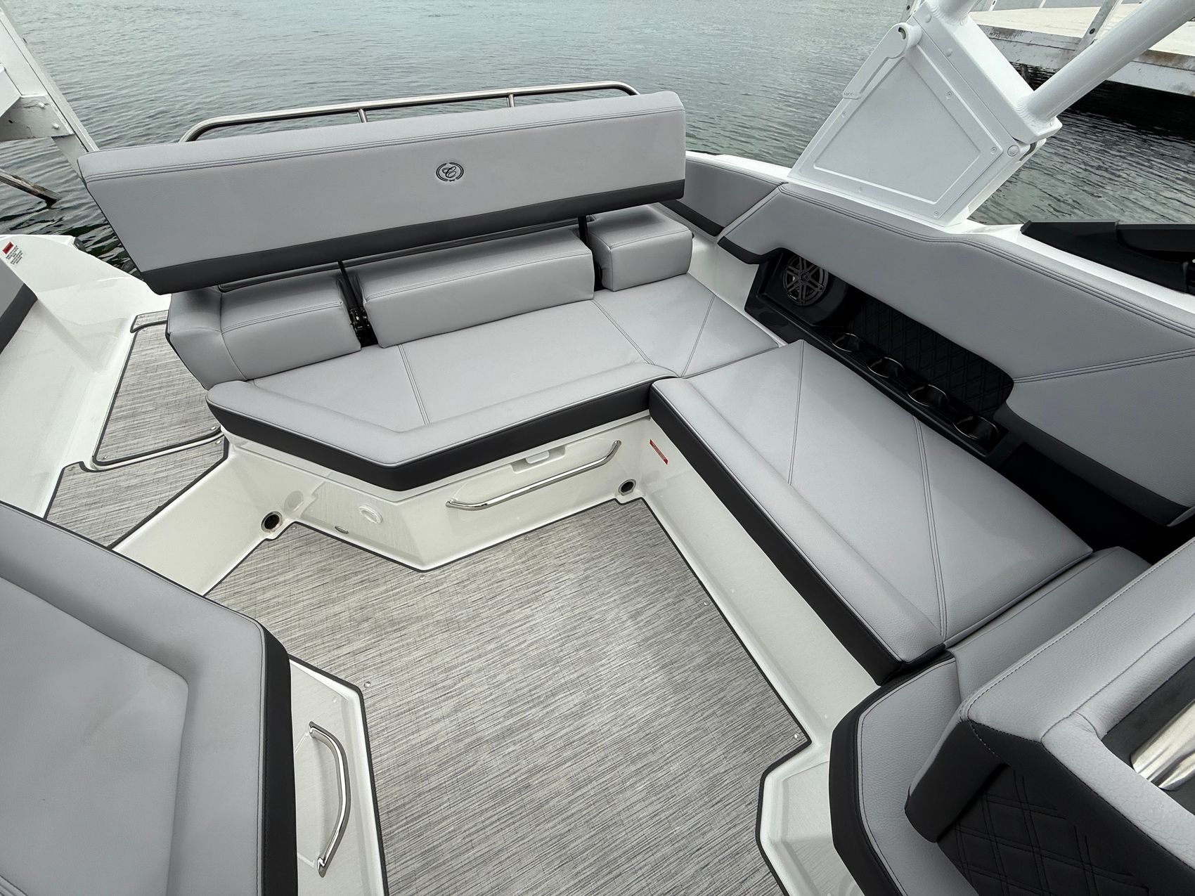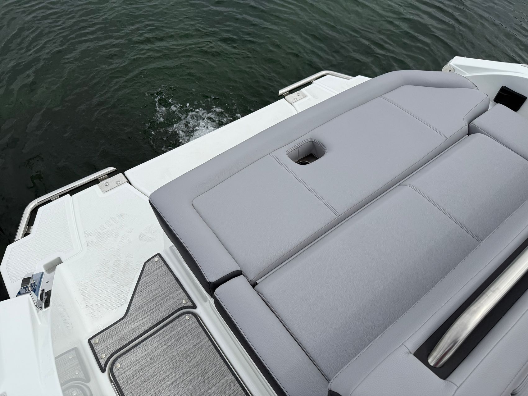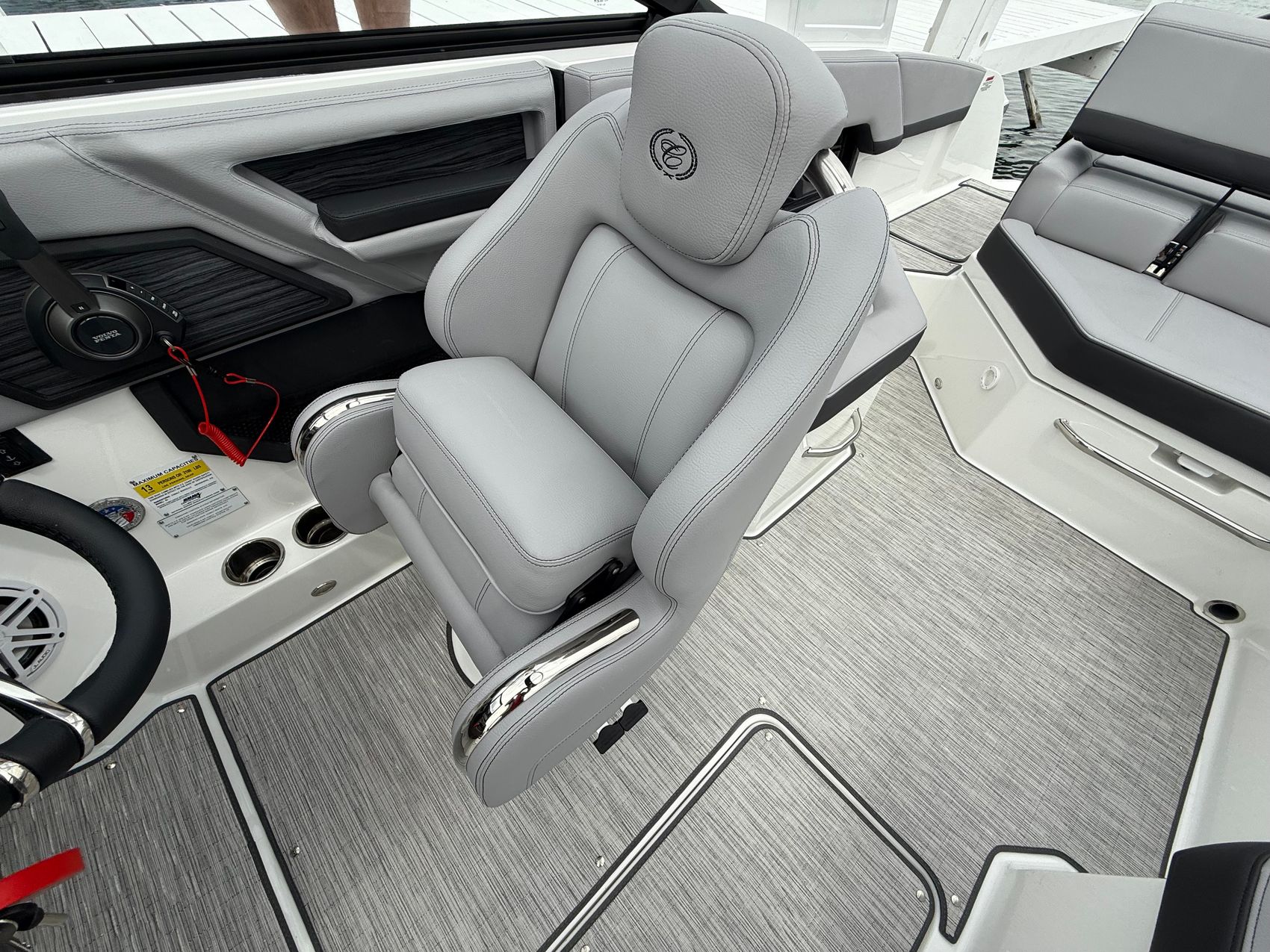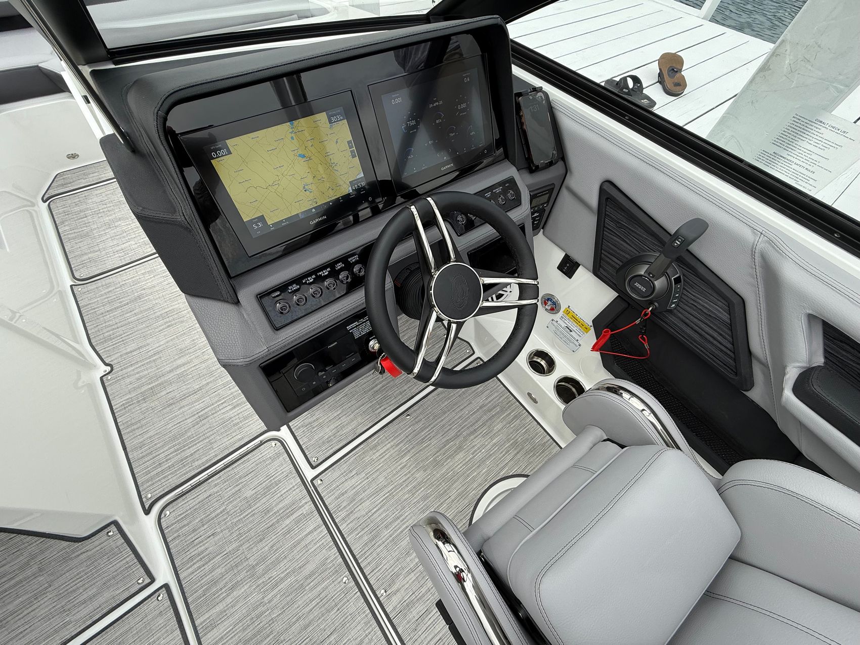 For ultimate convenience, the powerful all-chain Windlass anchor system makes docking effortless, while stainless steel docking lights enhance visibility in low-light conditions. The Trim Tabs with Indicators ensure a smooth ride in any water conditions.