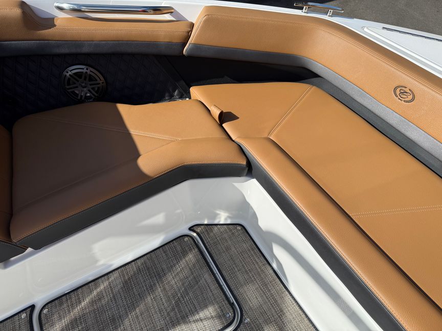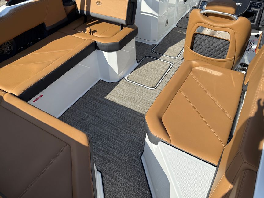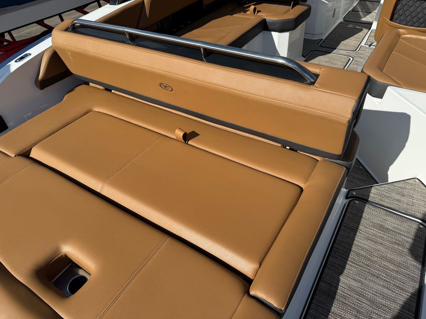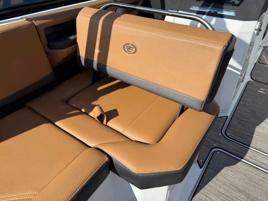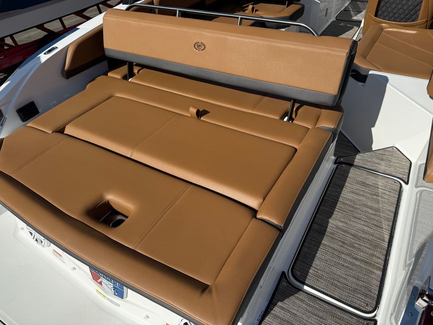 Inside, the Caramel/Carbon interior is complemented by the Dark Driftwood trim package and Sea Grass floor covering, offering a rich, elegant environment that feels more like a luxury lounge than a boat. RGB LED interior accent lighting sets the mood for evening cruises, while the leather color-matched steering wheel and dual Garmin 8610 glass cockpit displays put advanced control right at your fingertips.