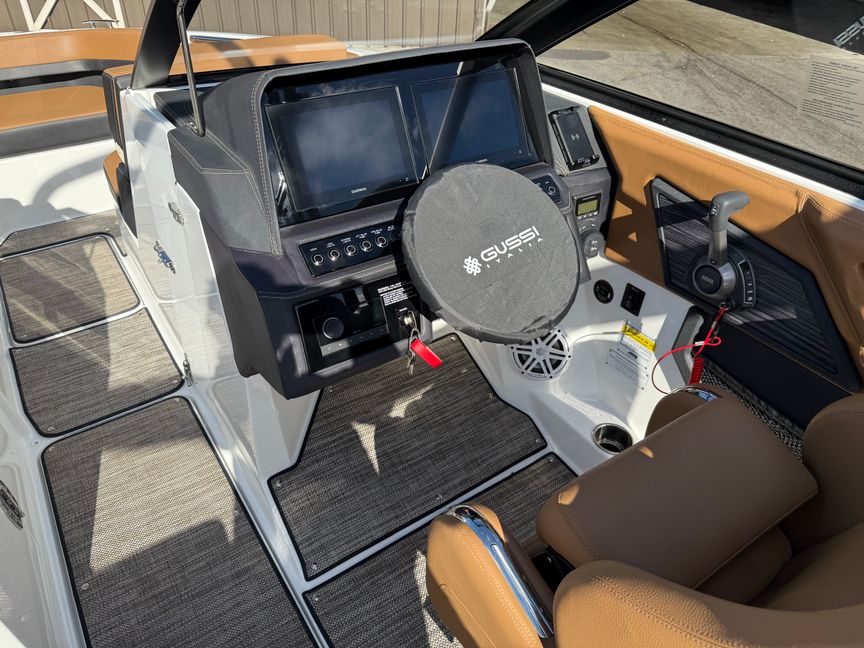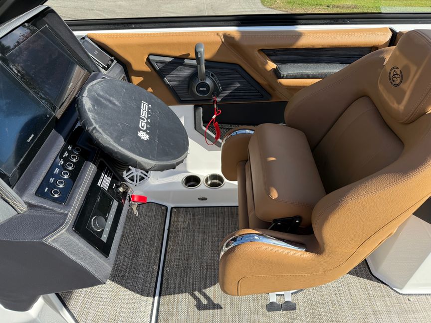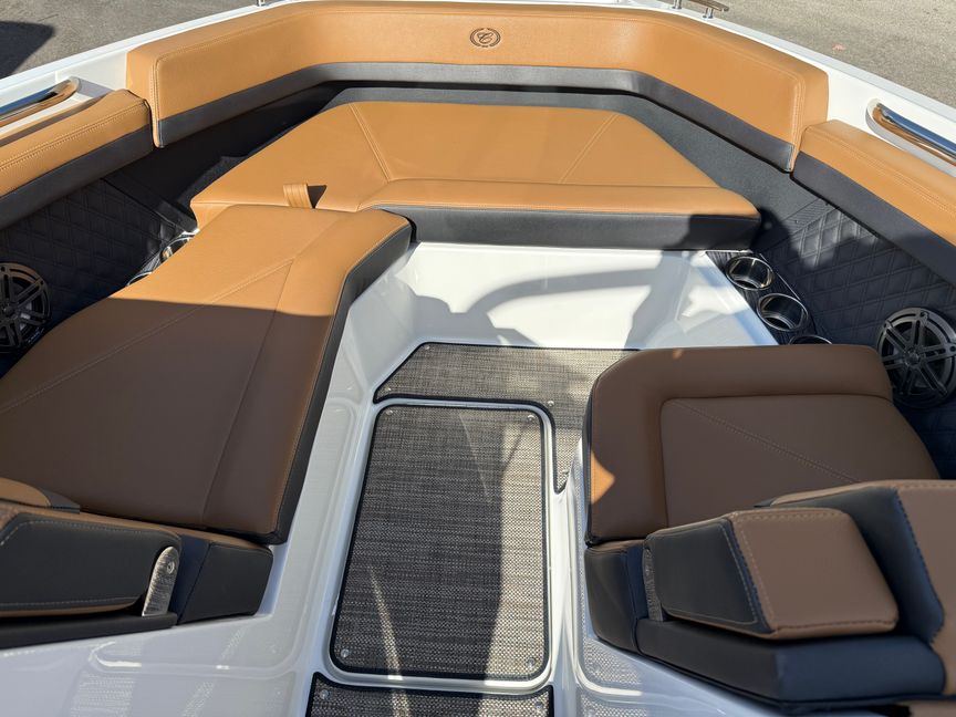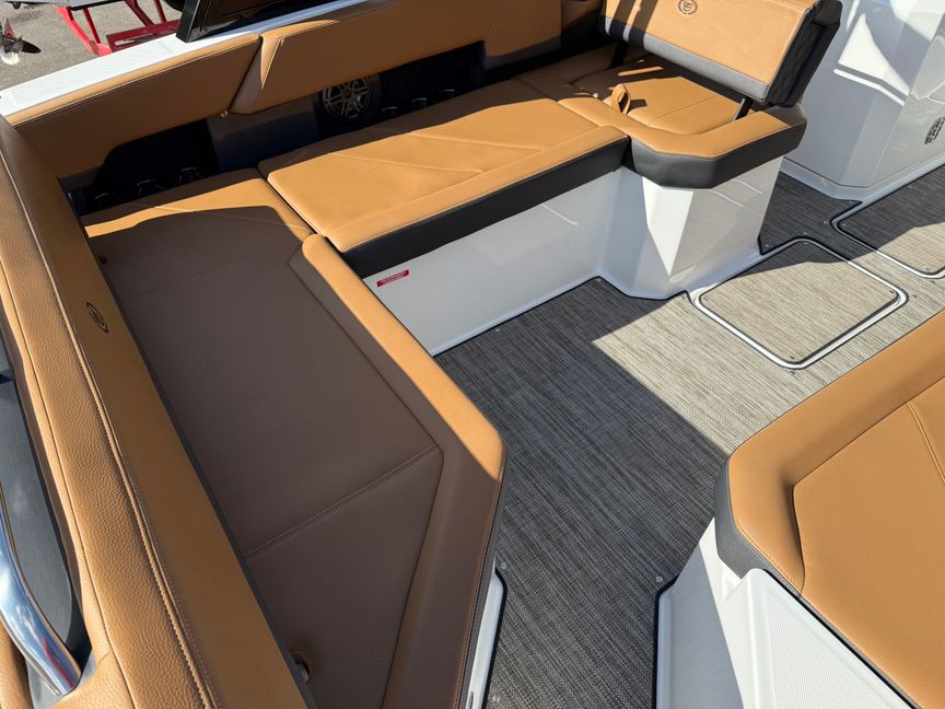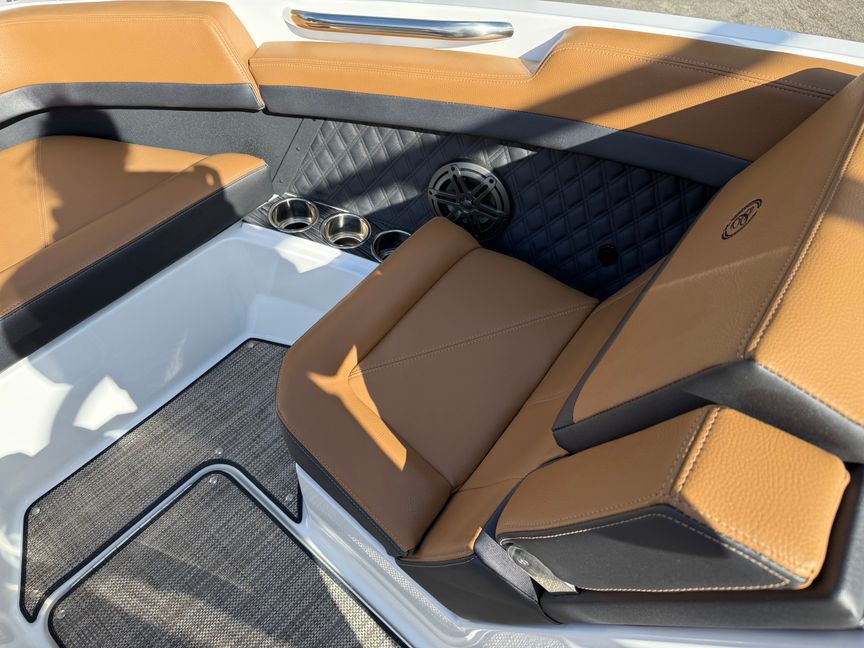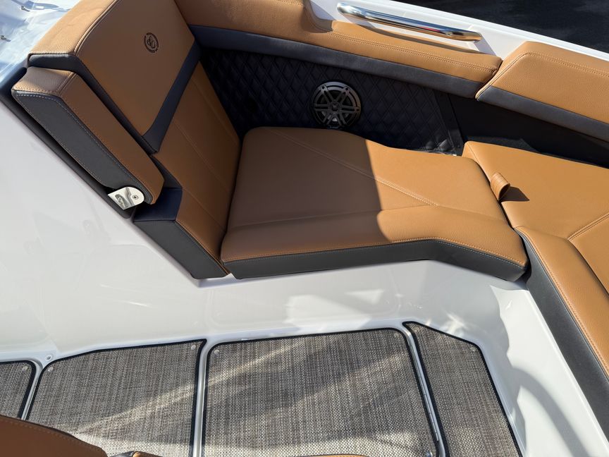 Inside, the Caramel/Carbon interior is complemented by the Dark Driftwood trim package and Sea Grass floor covering, offering a rich, elegant environment that feels more like a luxury lounge than a boat. RGB LED interior accent lighting sets the mood for evening cruises, while the leather color-matched steering wheel and dual Garmin 8610 glass cockpit displays put advanced control right at your fingertips.