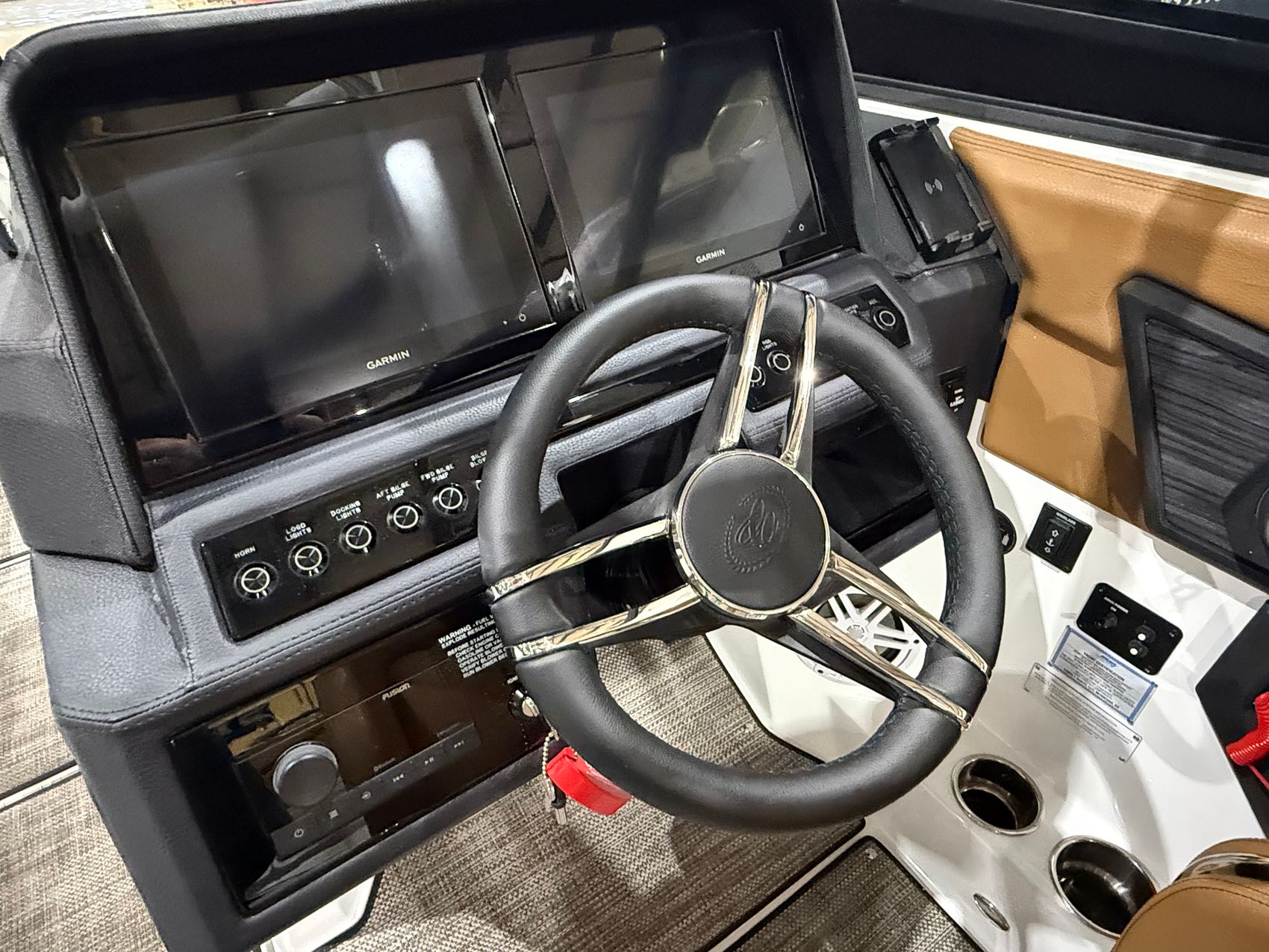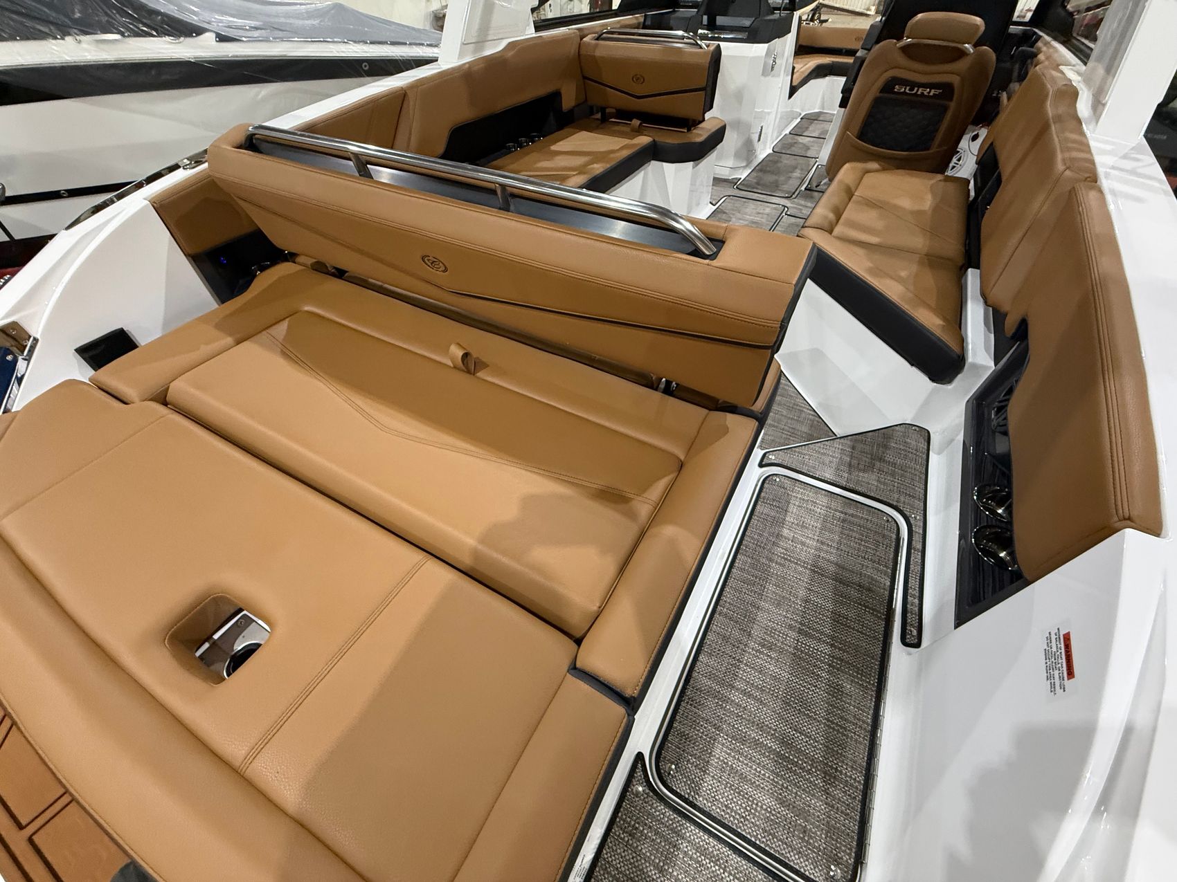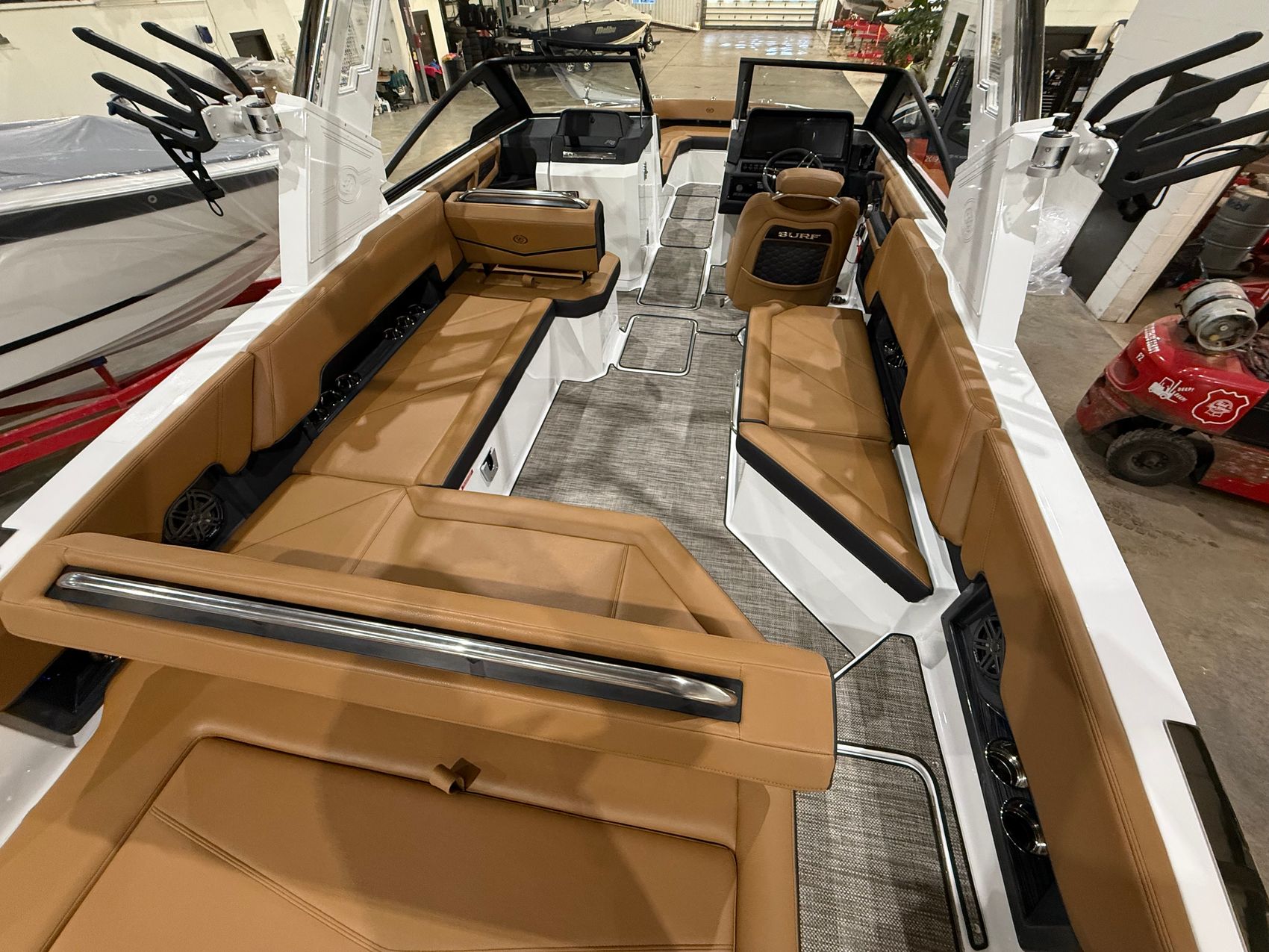 At the helm, dual Garmin 8610 glass cockpit displays provide intuitive control and crystal-clear visibility, seamlessly integrating navigation, engine data, and surf systems. Docking lights in stainless steel, trim tabs with indicators, and a battery maintainer ensure confident operation and effortless ownership.