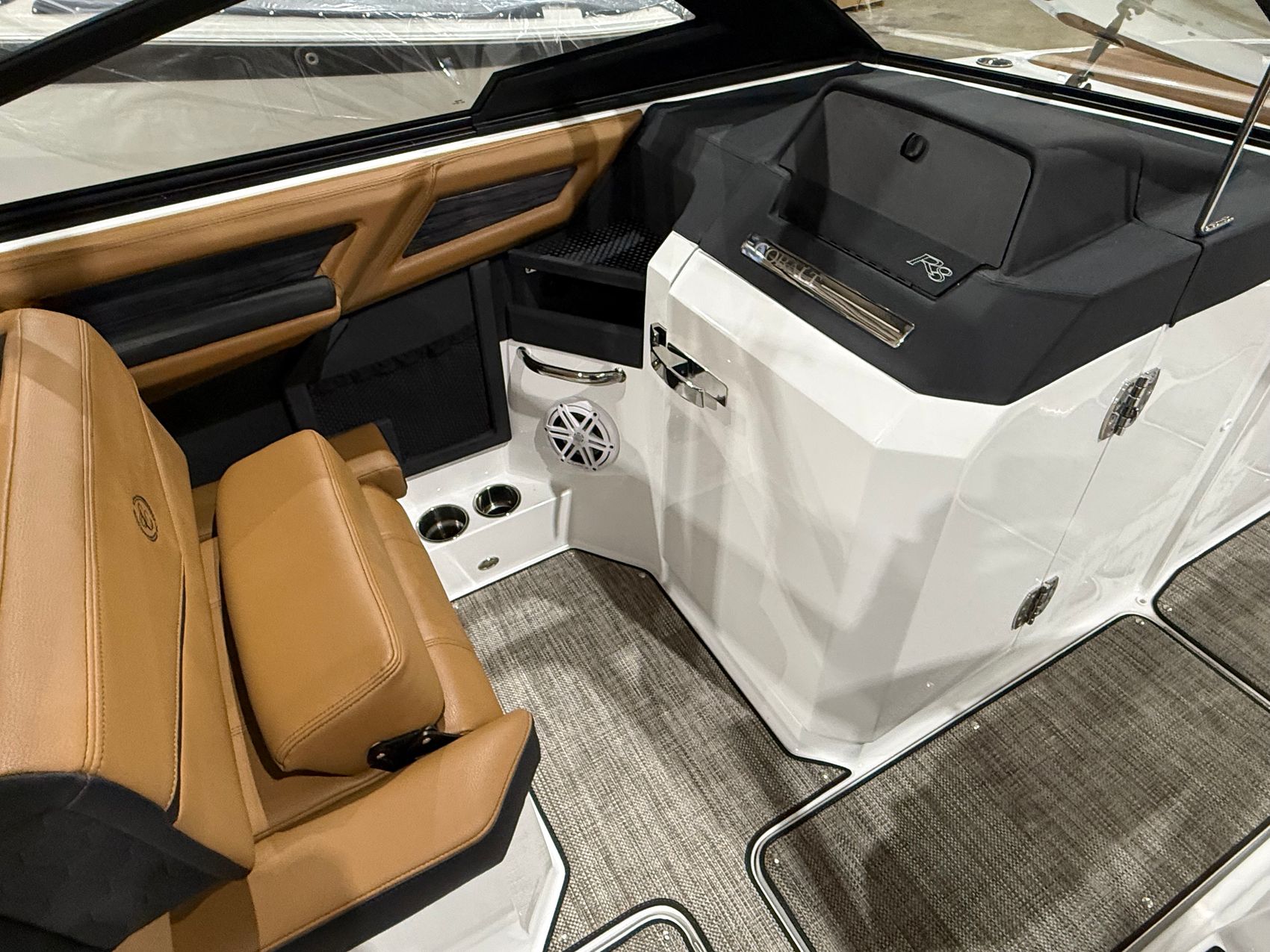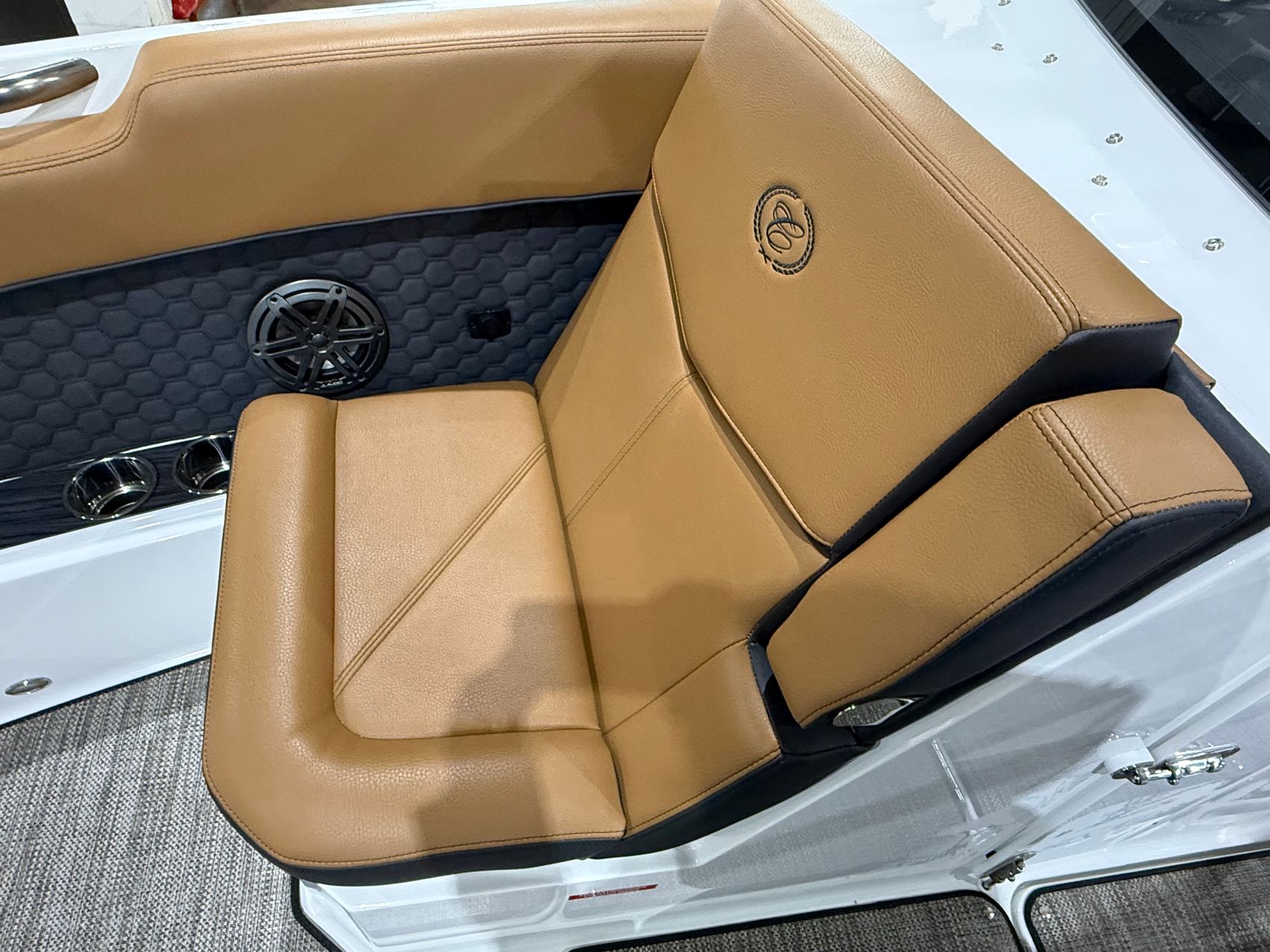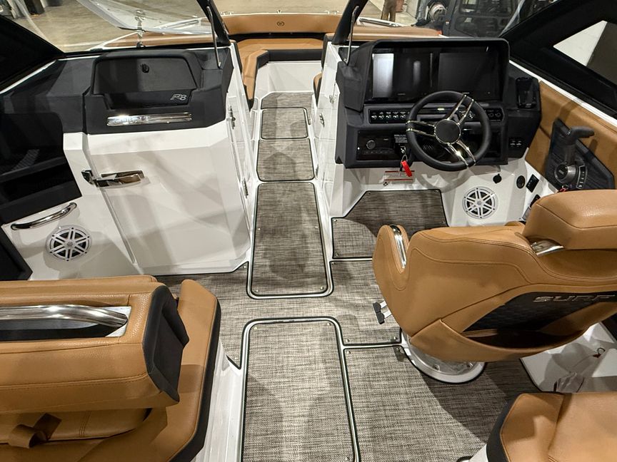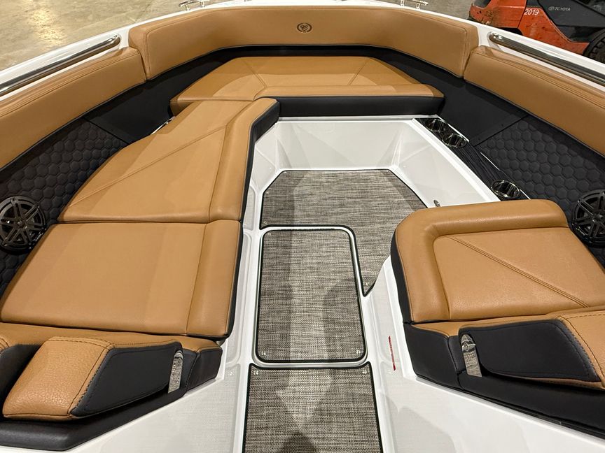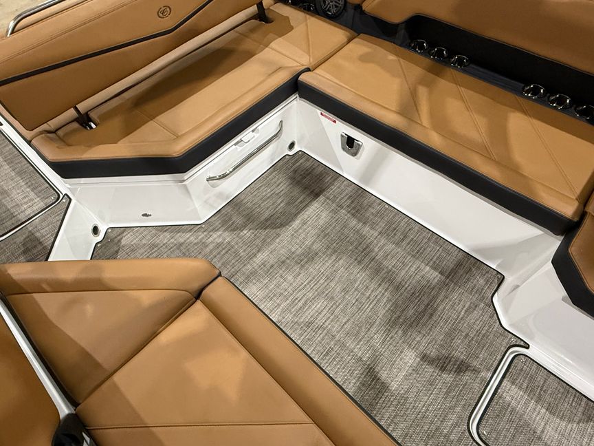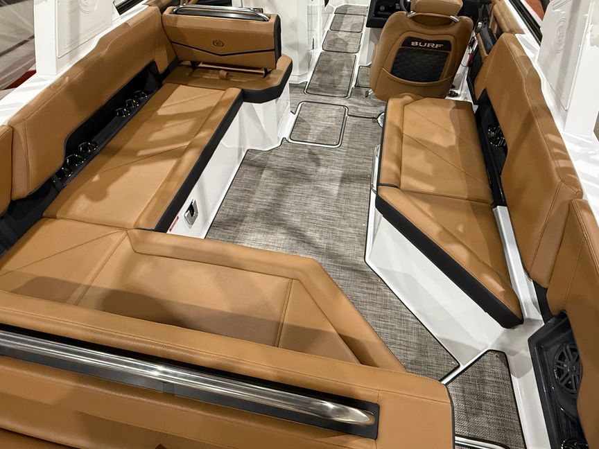 Finished in a striking Navy, White, and Frost Gray exterior, the R8 Surf makes an immediate statement at the dock. Step inside and you’re welcomed by a rich Caramel and Carbon interior, accented with premium materials and Cobalt’s legendary attention to detail. Every surface, stitch, and touchpoint reflects the brand’s commitment to timeless design and uncompromising quality.