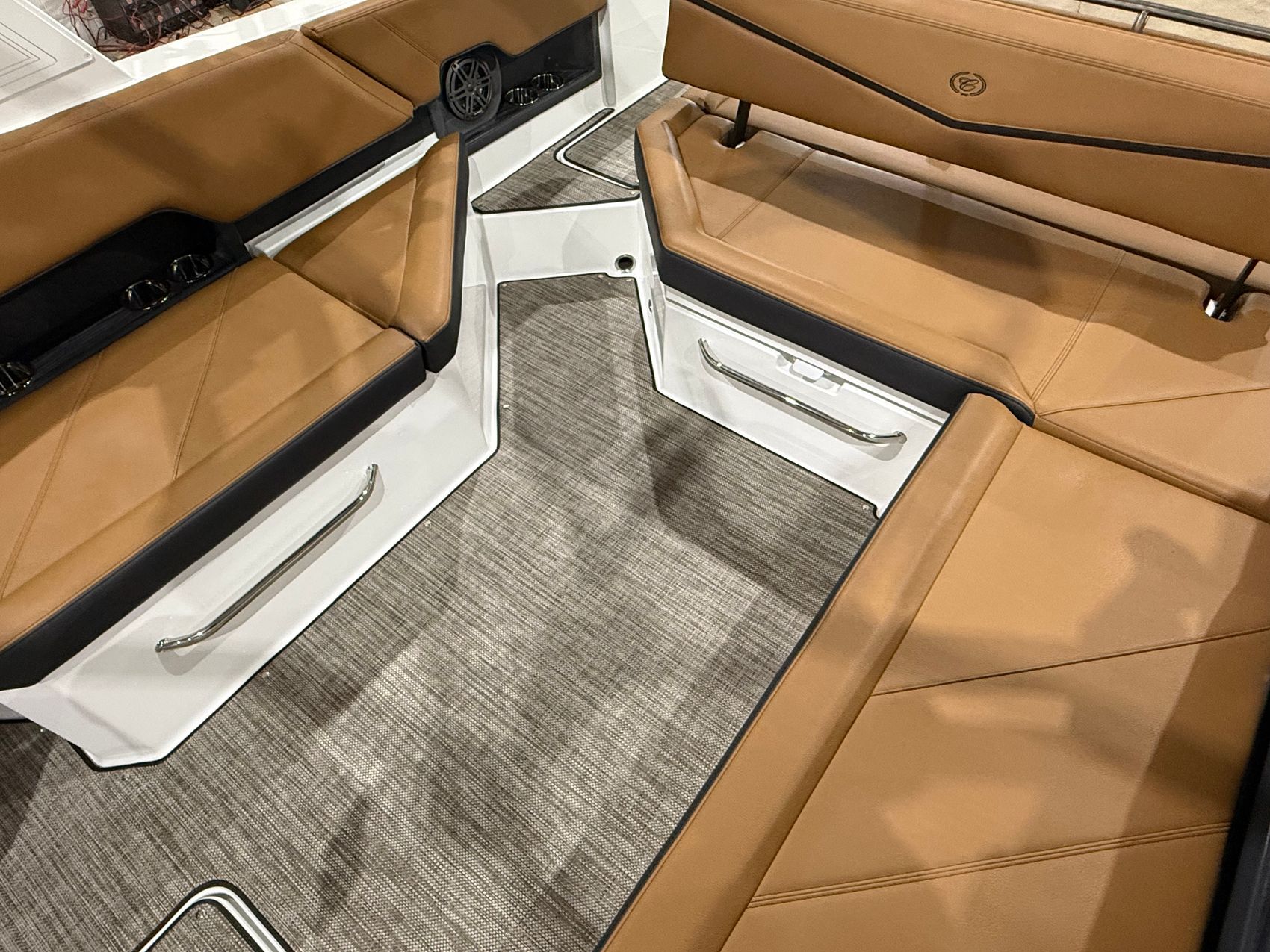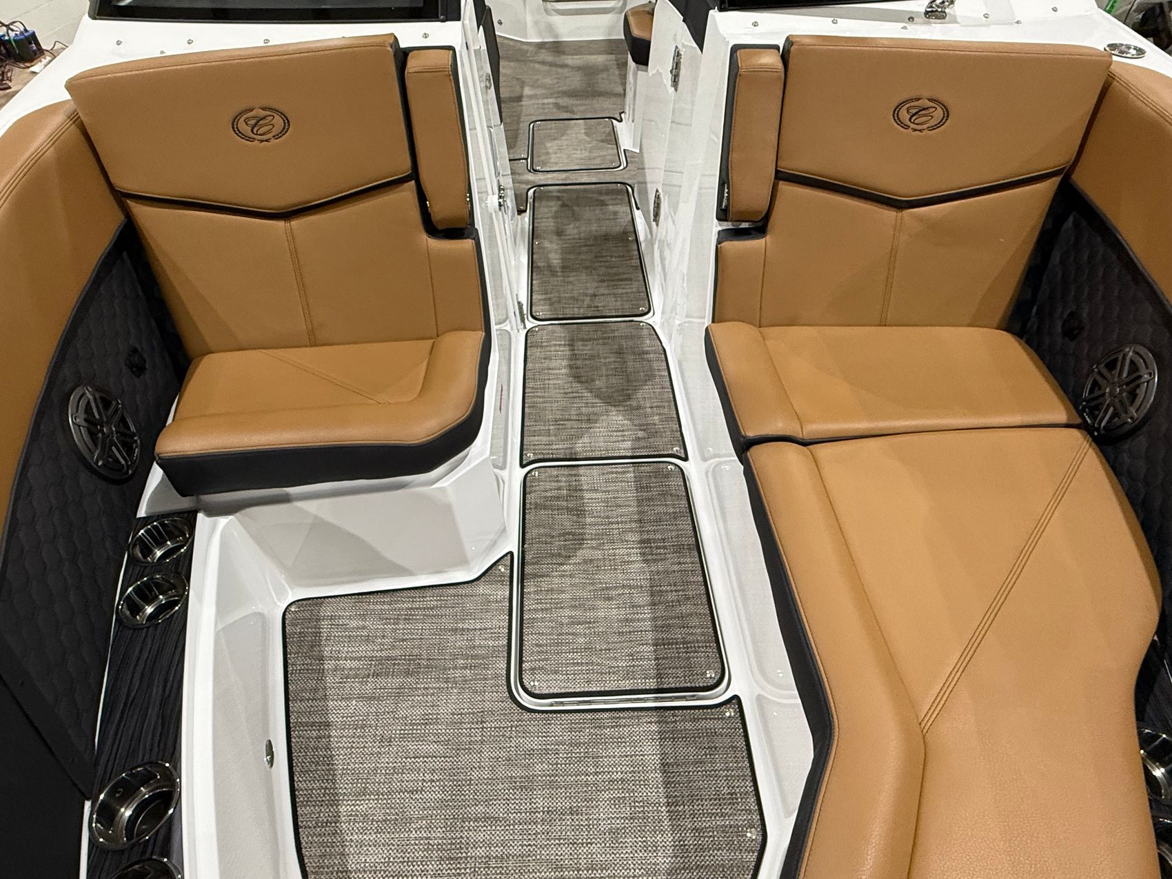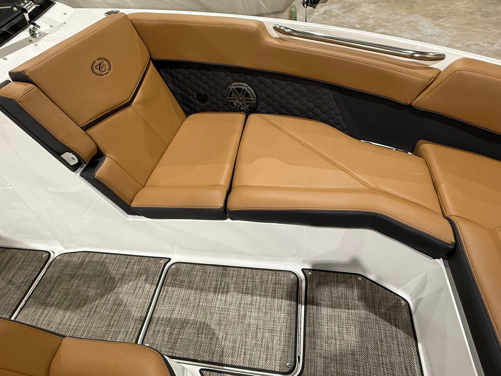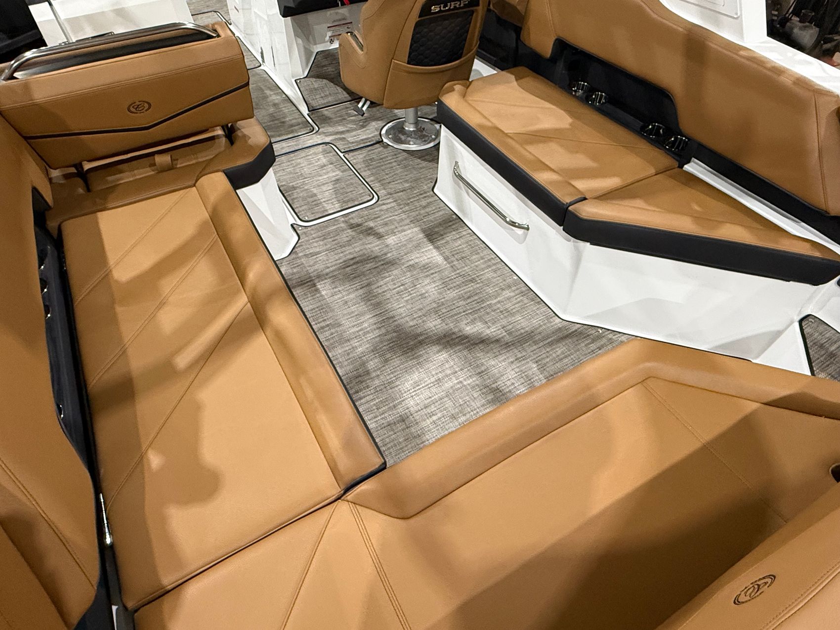 Finished in a striking Navy, White, and Frost Gray exterior, the R8 Surf makes an immediate statement at the dock. Step inside and you’re welcomed by a rich Caramel and Carbon interior, accented with premium materials and Cobalt’s legendary attention to detail. Every surface, stitch, and touchpoint reflects the brand’s commitment to timeless design and uncompromising quality.