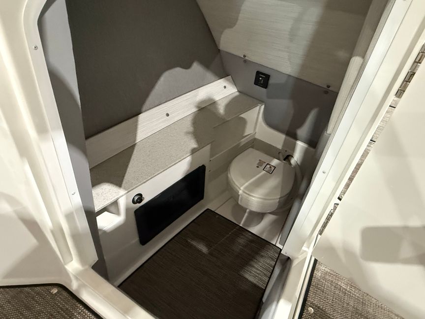 This R8 Surf is built to entertain and relax. Enjoy your favorite music through the premium sound system with transom speakers, set the mood with RGB LED interior accent lighting, and take advantage of thoughtful comforts like wireless phone charging, a solid teak dinette table, and sea grass flooring that’s both beautiful and practical. A fully enclosed head with electric porcelain toilet adds true day-long usability for family and guests.