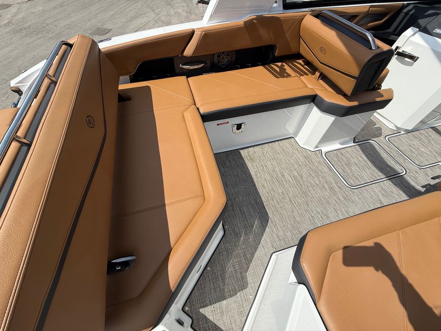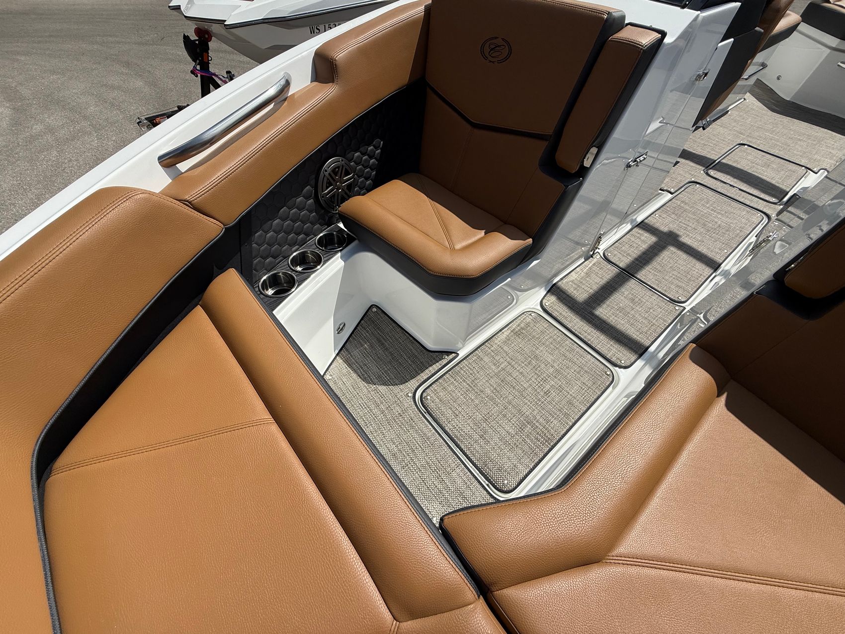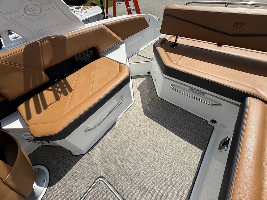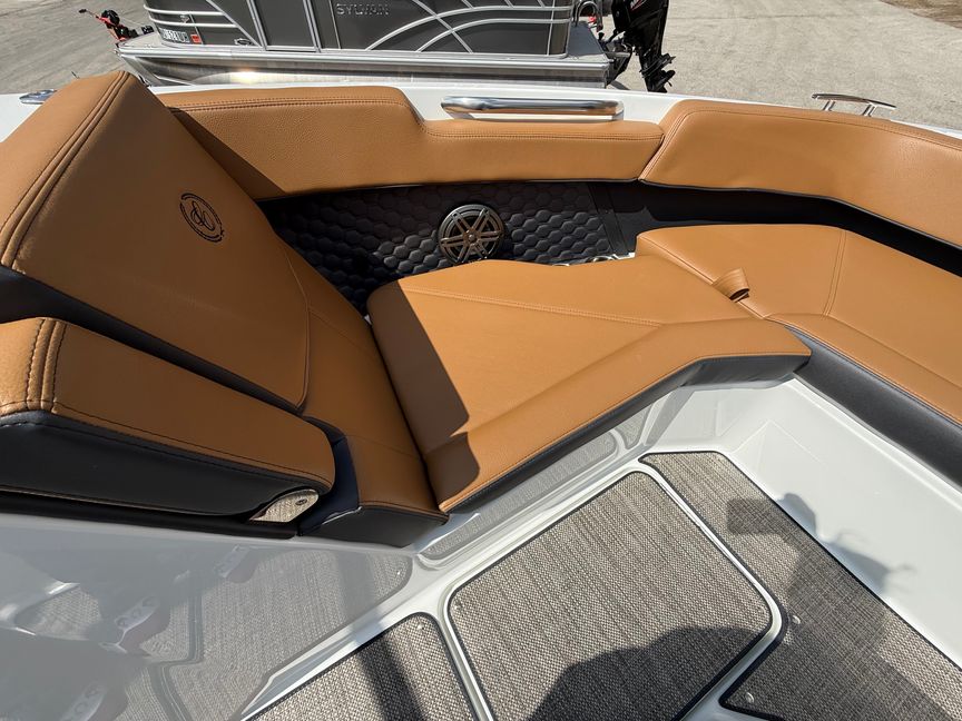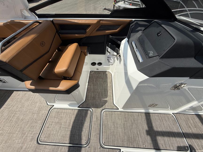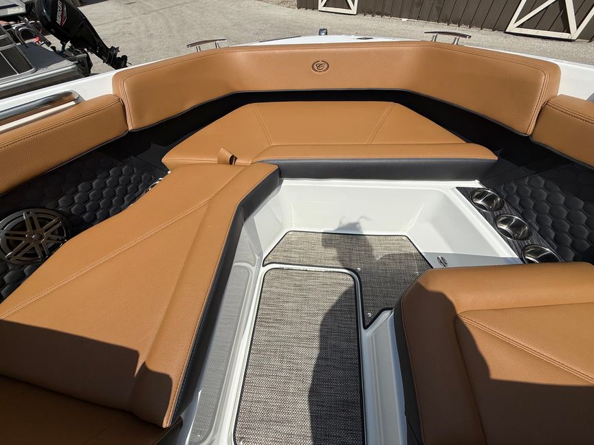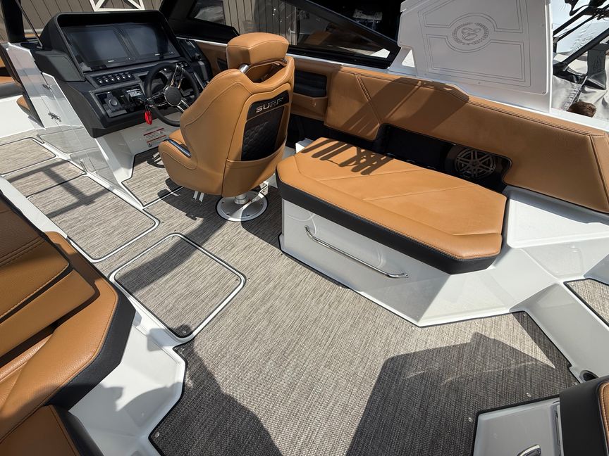 From the moment you step aboard, the R6 Surf sets a new standard. The rich Caramel and Carbon interior paired with the Dark Driftwood trim package creates a warm, modern atmosphere that feels more like a premium lounge than a traditional boat. Underfoot, sea grass flooring adds both sophistication and durability, while customizable RGB interior lighting transforms sunset cruises into an elevated nighttime experience.