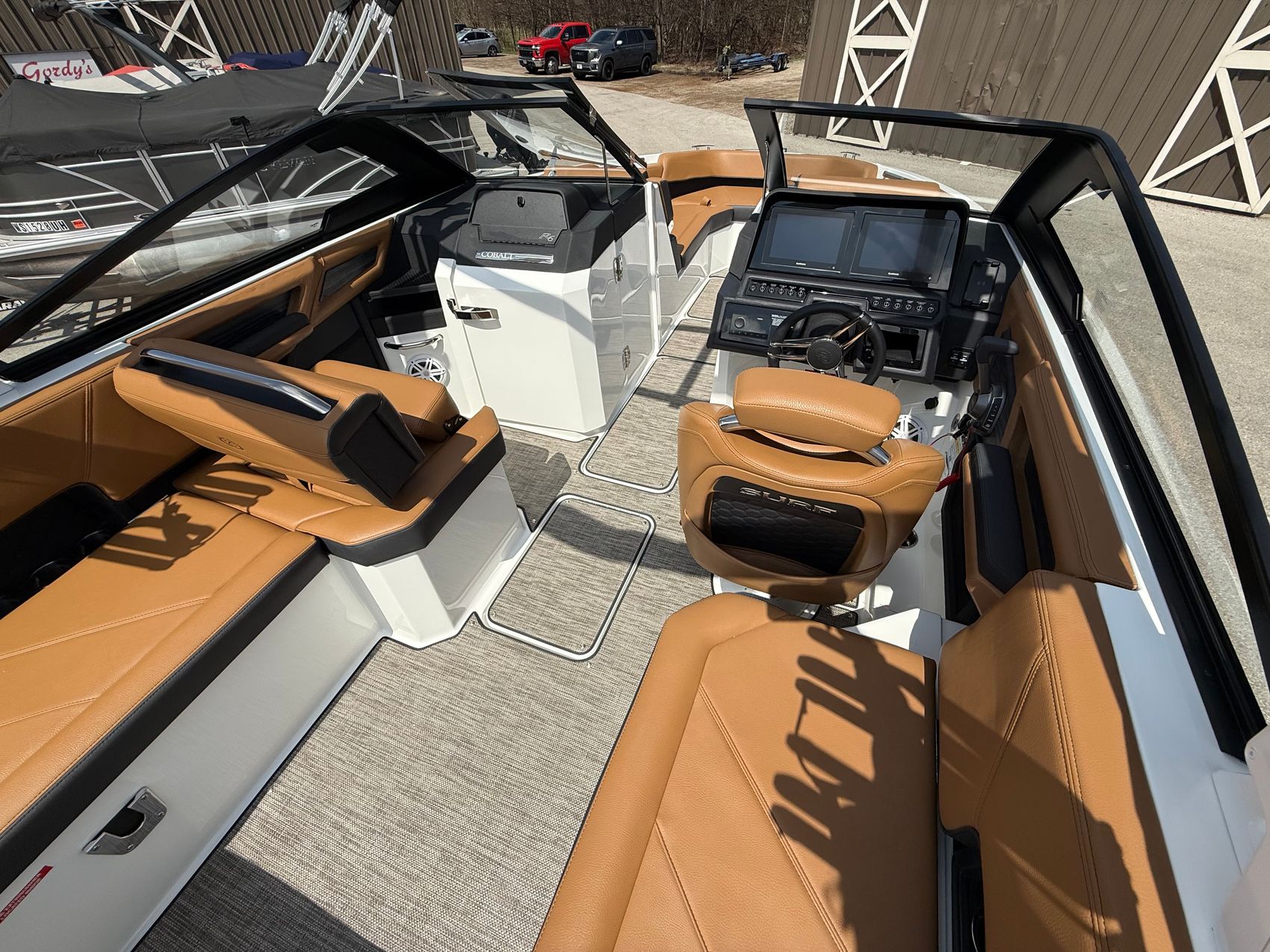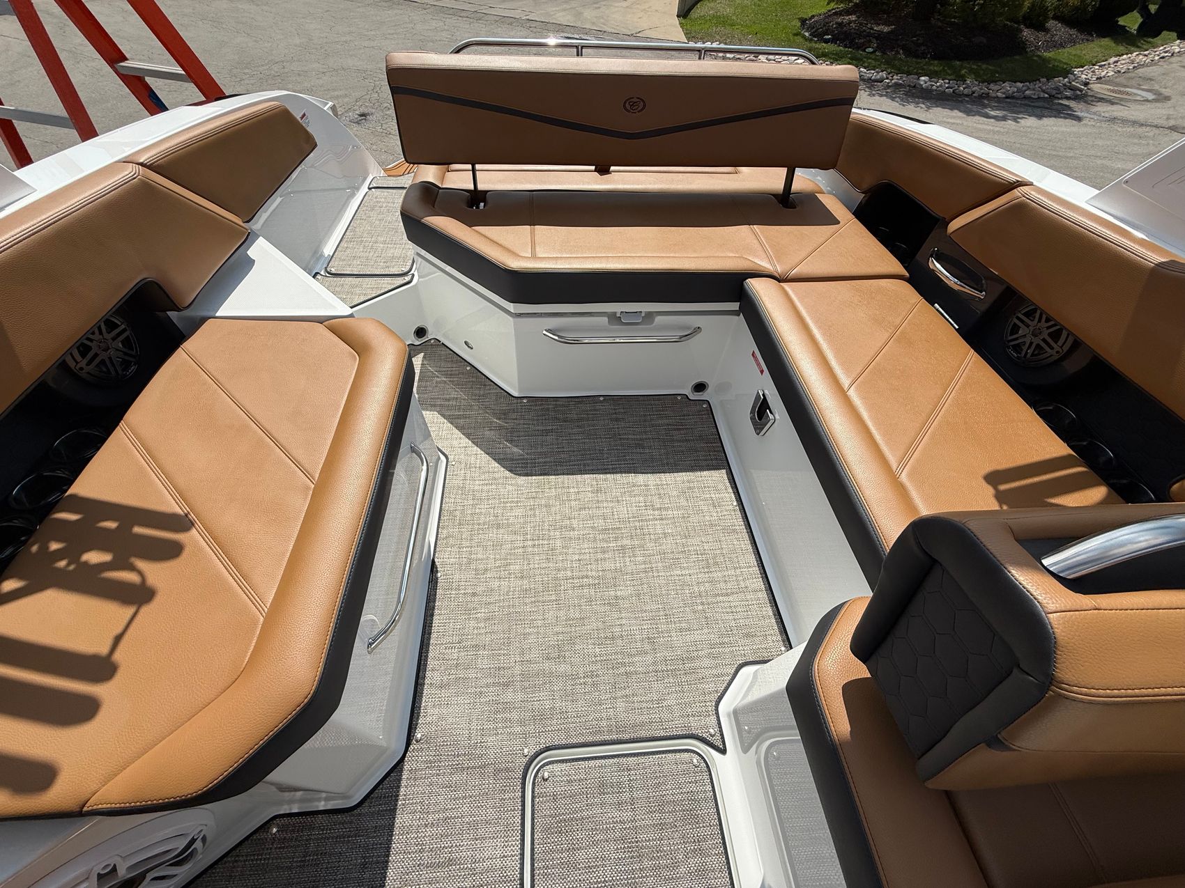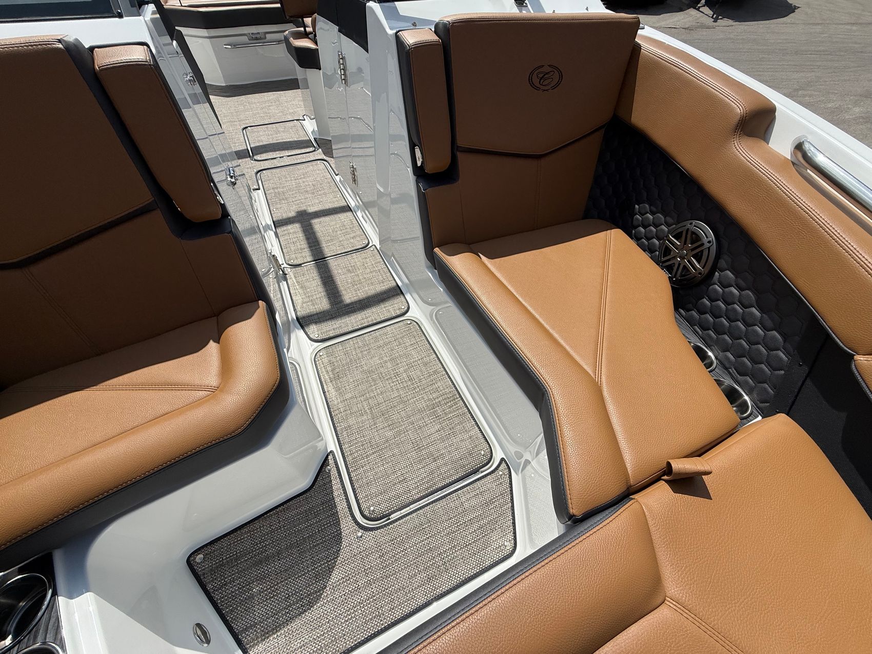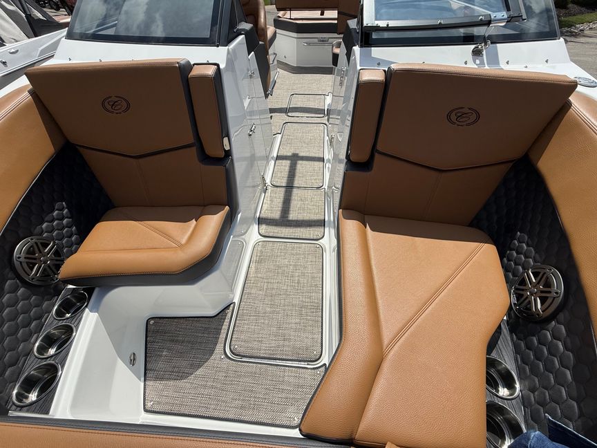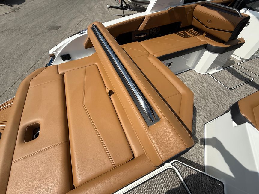 From the moment you step aboard, the R6 Surf sets a new standard. The rich Caramel and Carbon interior paired with the Dark Driftwood trim package creates a warm, modern atmosphere that feels more like a premium lounge than a traditional boat. Underfoot, sea grass flooring adds both sophistication and durability, while customizable RGB interior lighting transforms sunset cruises into an elevated nighttime experience.