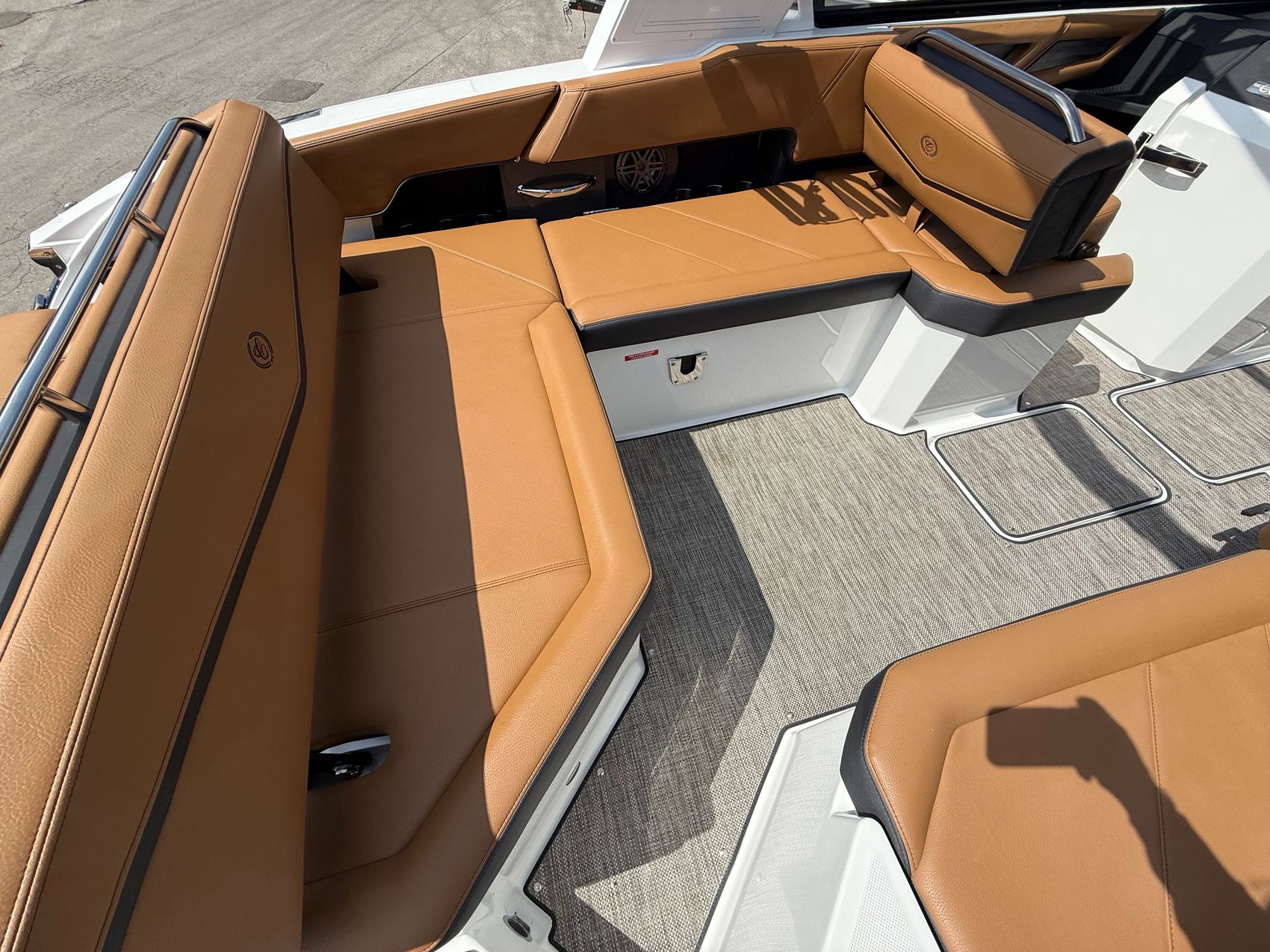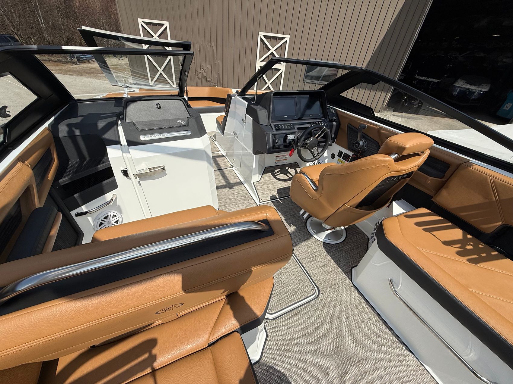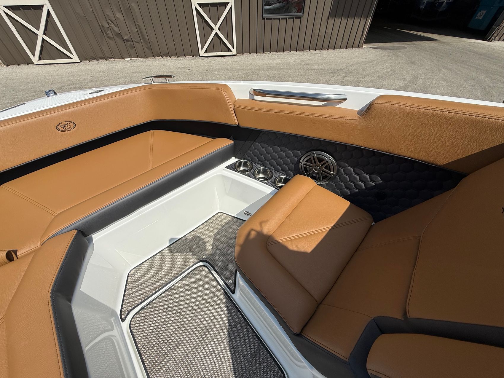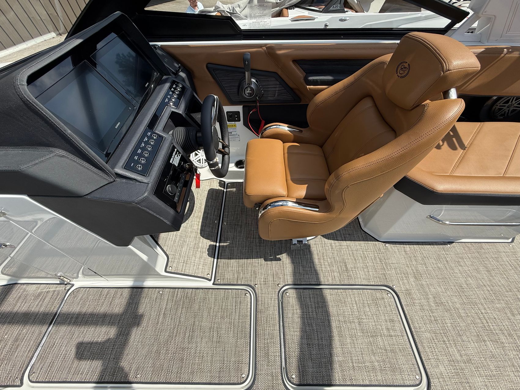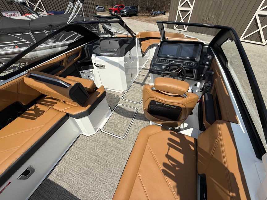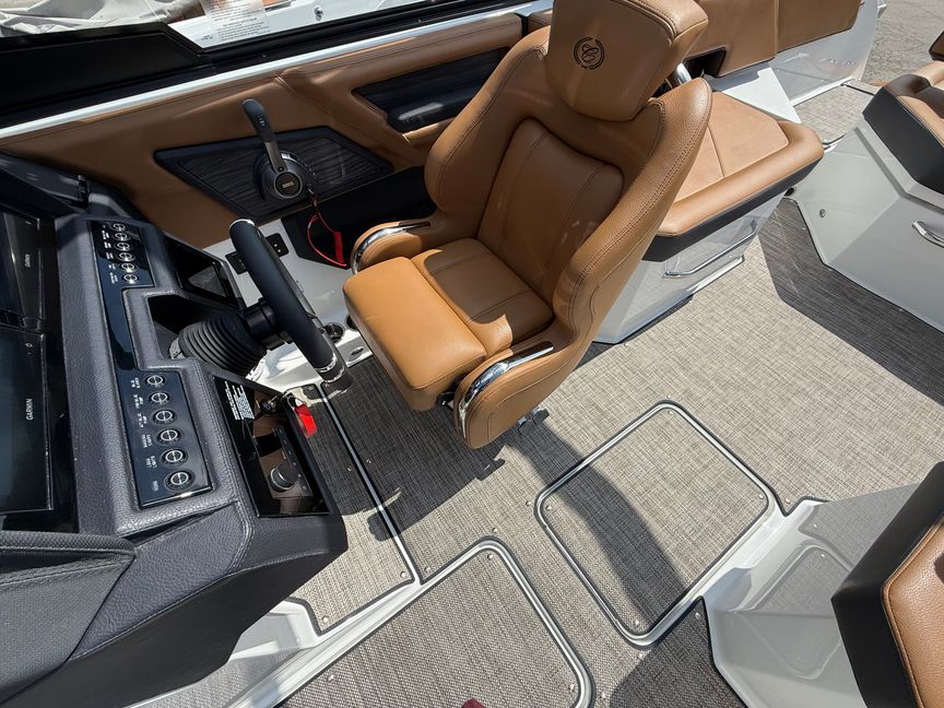 At the helm, innovation meets intuition. The dual Garmin glass cockpit displays deliver seamless control and crystal-clear navigation, complemented by a wireless charging station that keeps your essentials powered without clutter. A rear-facing camera enhances docking confidence, while stainless steel docking lights ensure visibility when returning to the marina after a perfect evening on the lake.