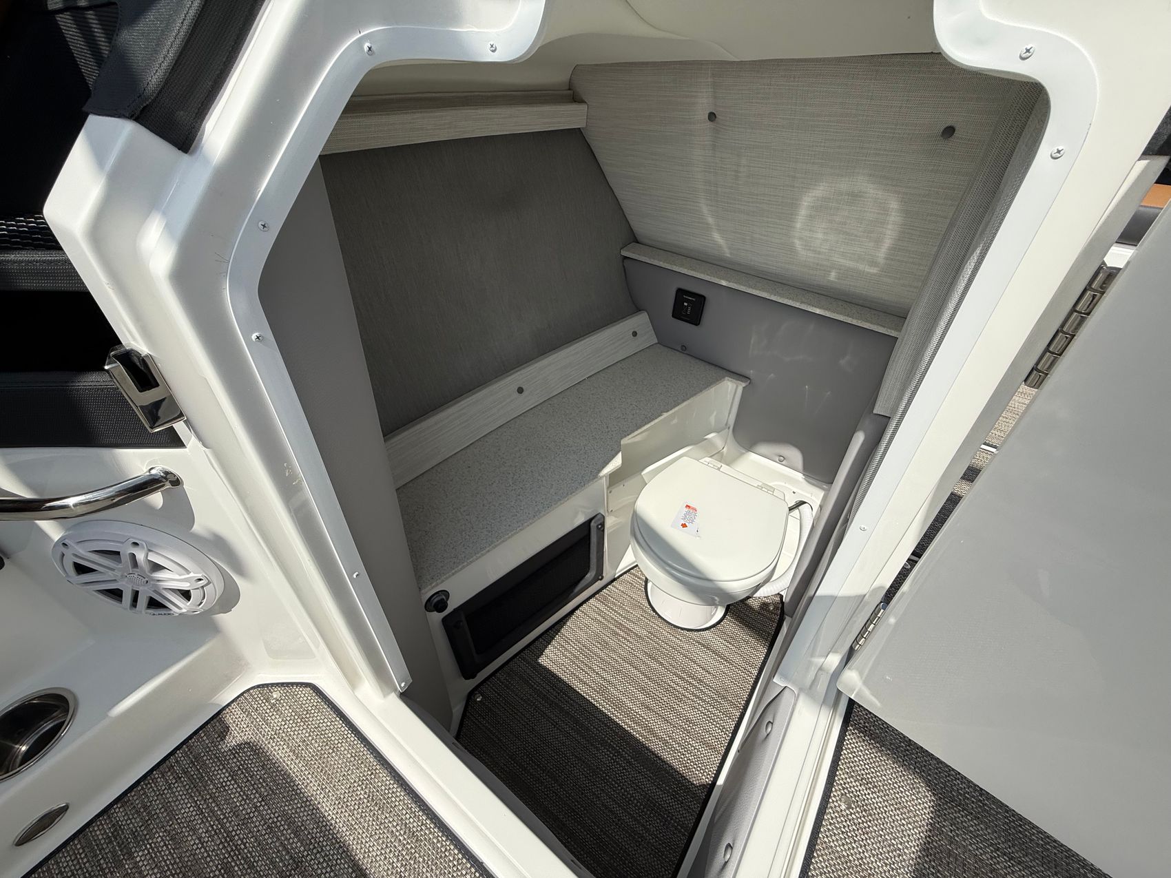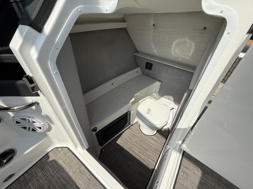 The electrically folding Prisma arch with integrated bimini delivers both striking presence and practical versatility, while premium sound with transom speakers ensures your soundtrack carries effortlessly from cockpit to swim platform. Thoughtful luxuries like the solid teak dinette table, electric porcelain head, windlass anchor system, and full tonneau covers make full-day and weekend outings effortless.