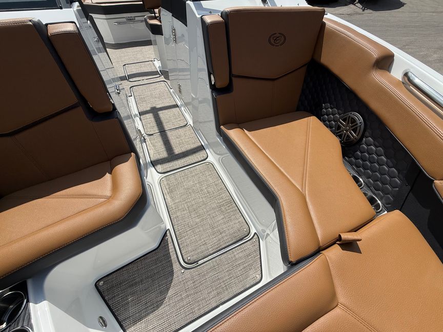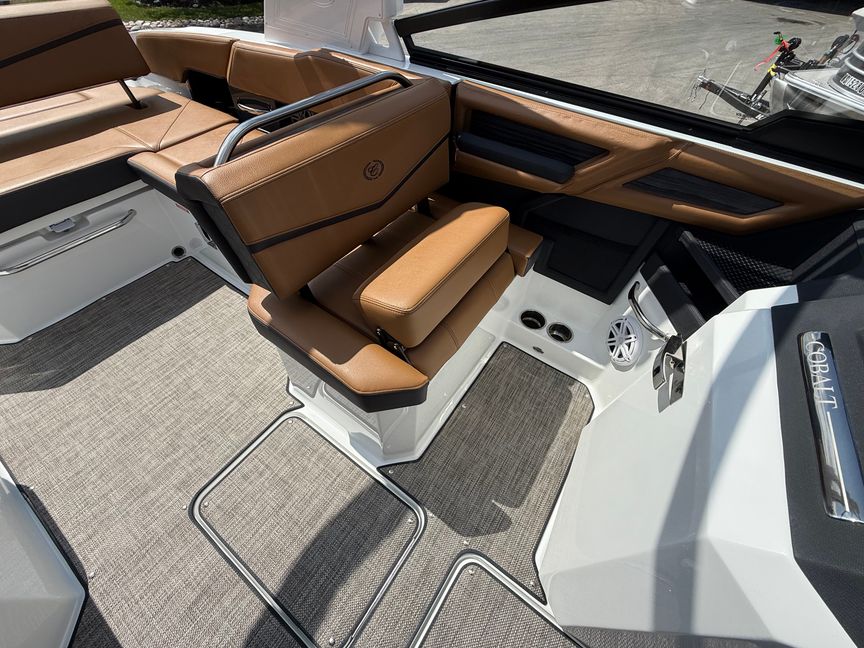 Performance is equally refined. Powered by a forward-facing Volvo V8-350CE engine, the R6 Surf produces smooth acceleration, quiet operation, and perfectly sculpted waves thanks to Cobalt’s advanced surf system and trim tab control. Whether you’re carving endless surf sets or cruising with friends, every ride feels composed, responsive, and unmistakably premium.