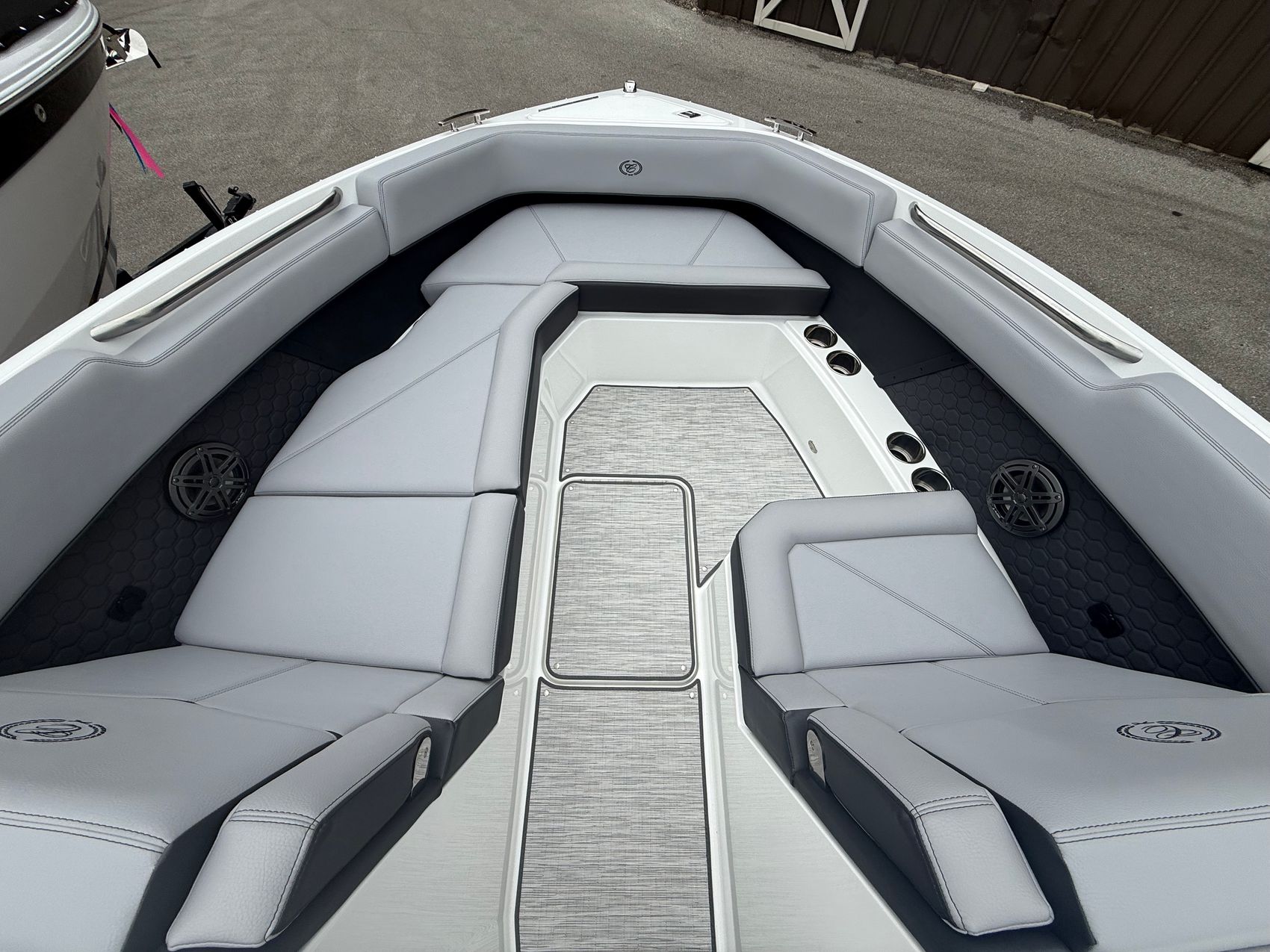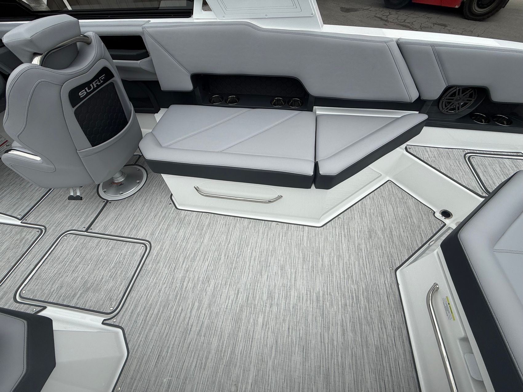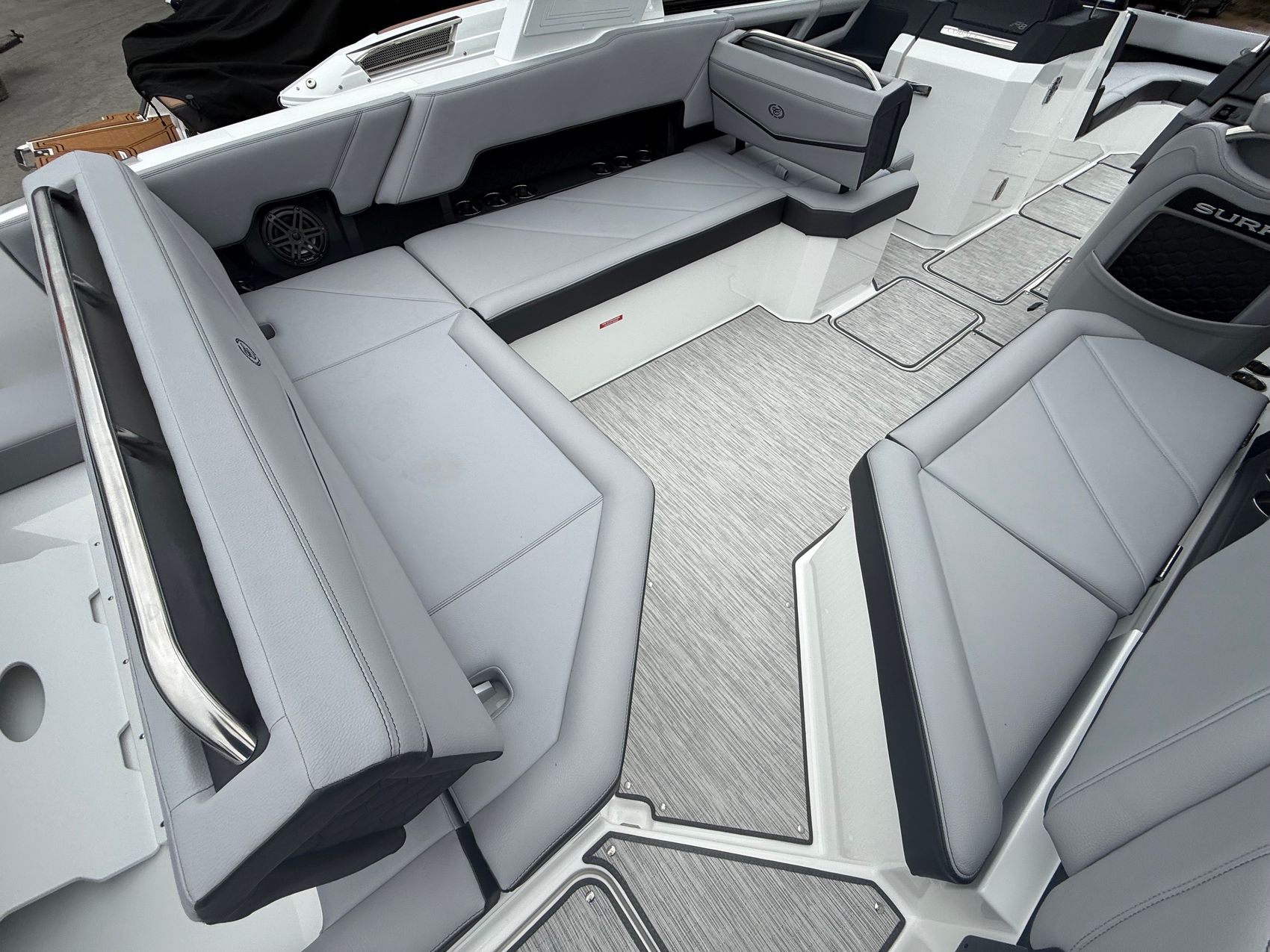 At the heart of this R8 Surf is the Volvo V8-430CE forward-facing engine, delivering next-level performance with deep reserves of torque and precision control. Whether you’re building the perfect endless wave or cruising with a full crew, this powerhouse responds with authority—smooth, quiet, and effortlessly capable.