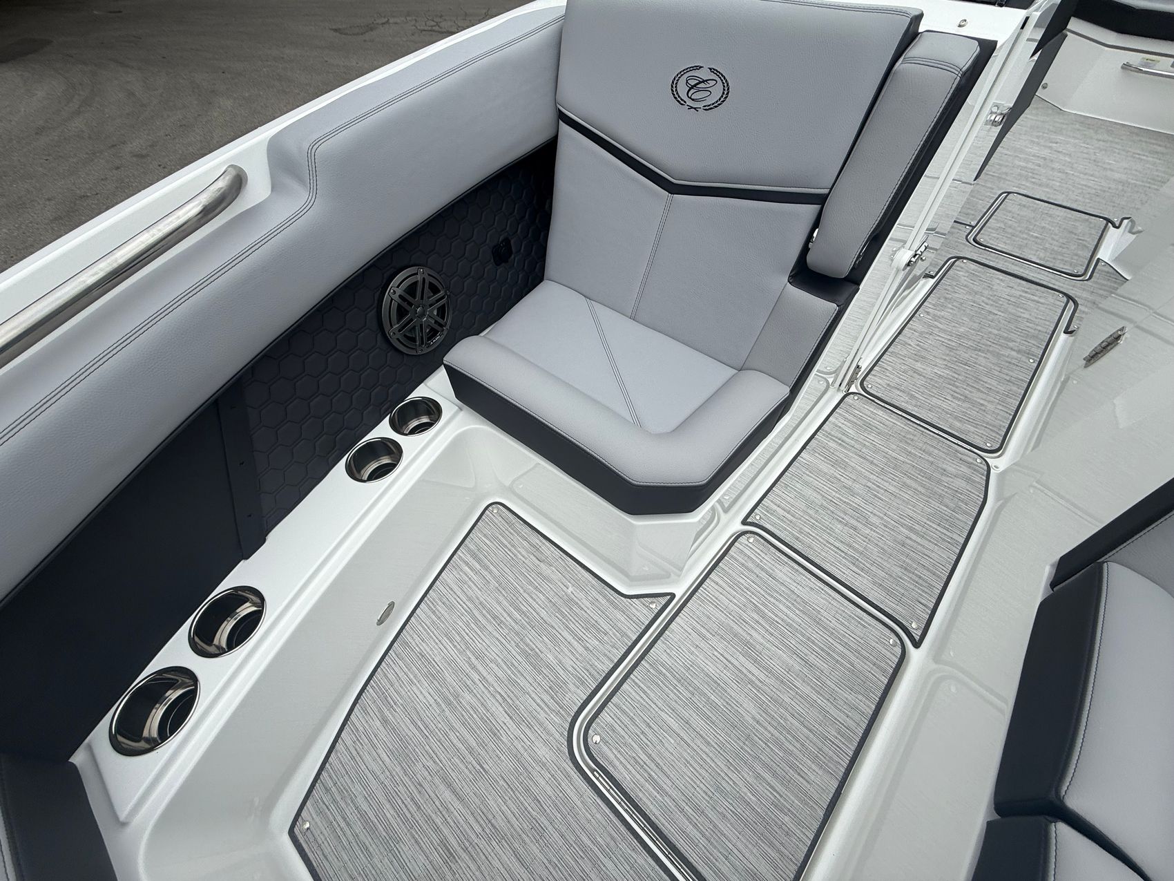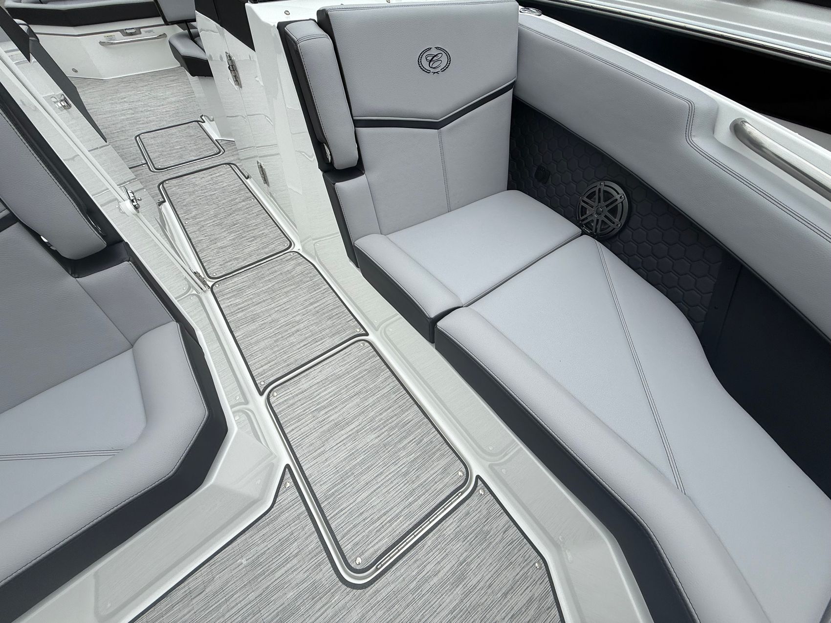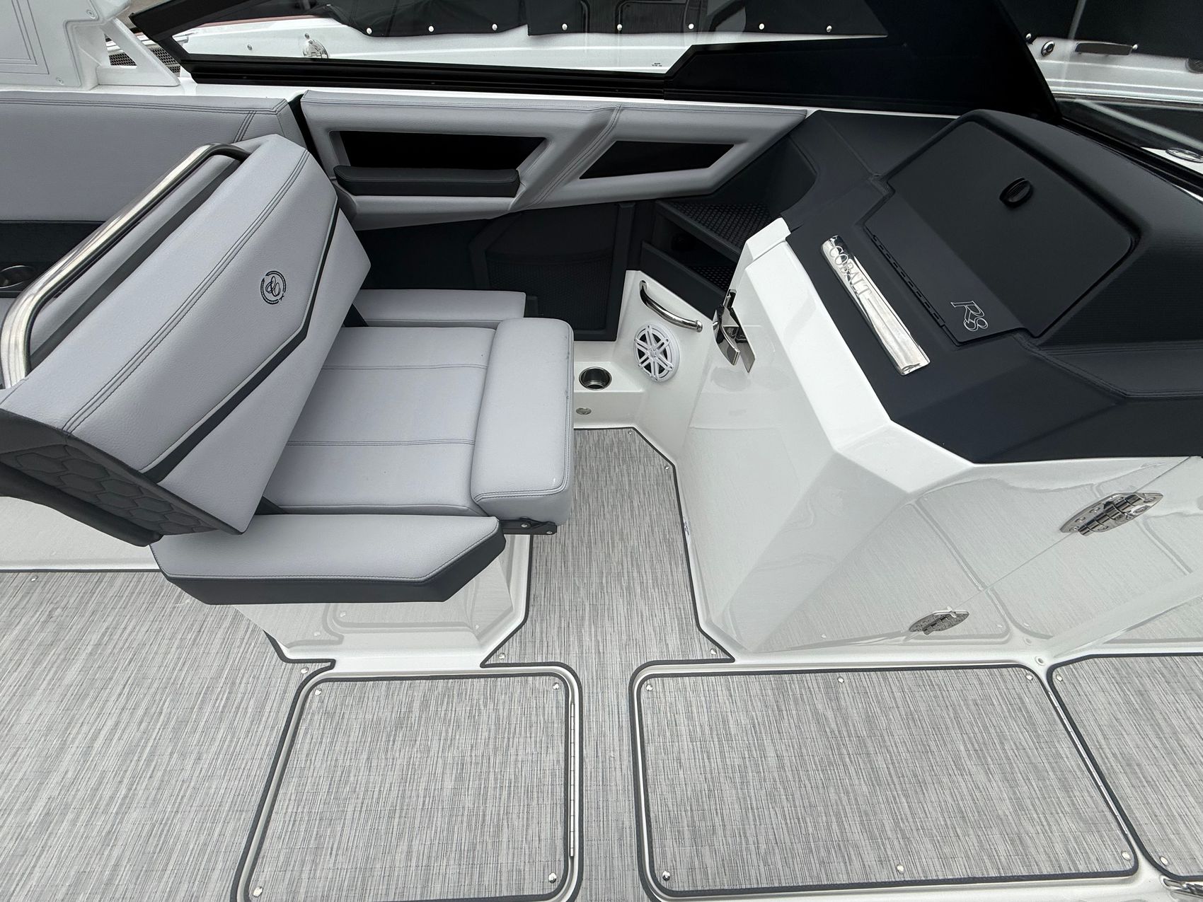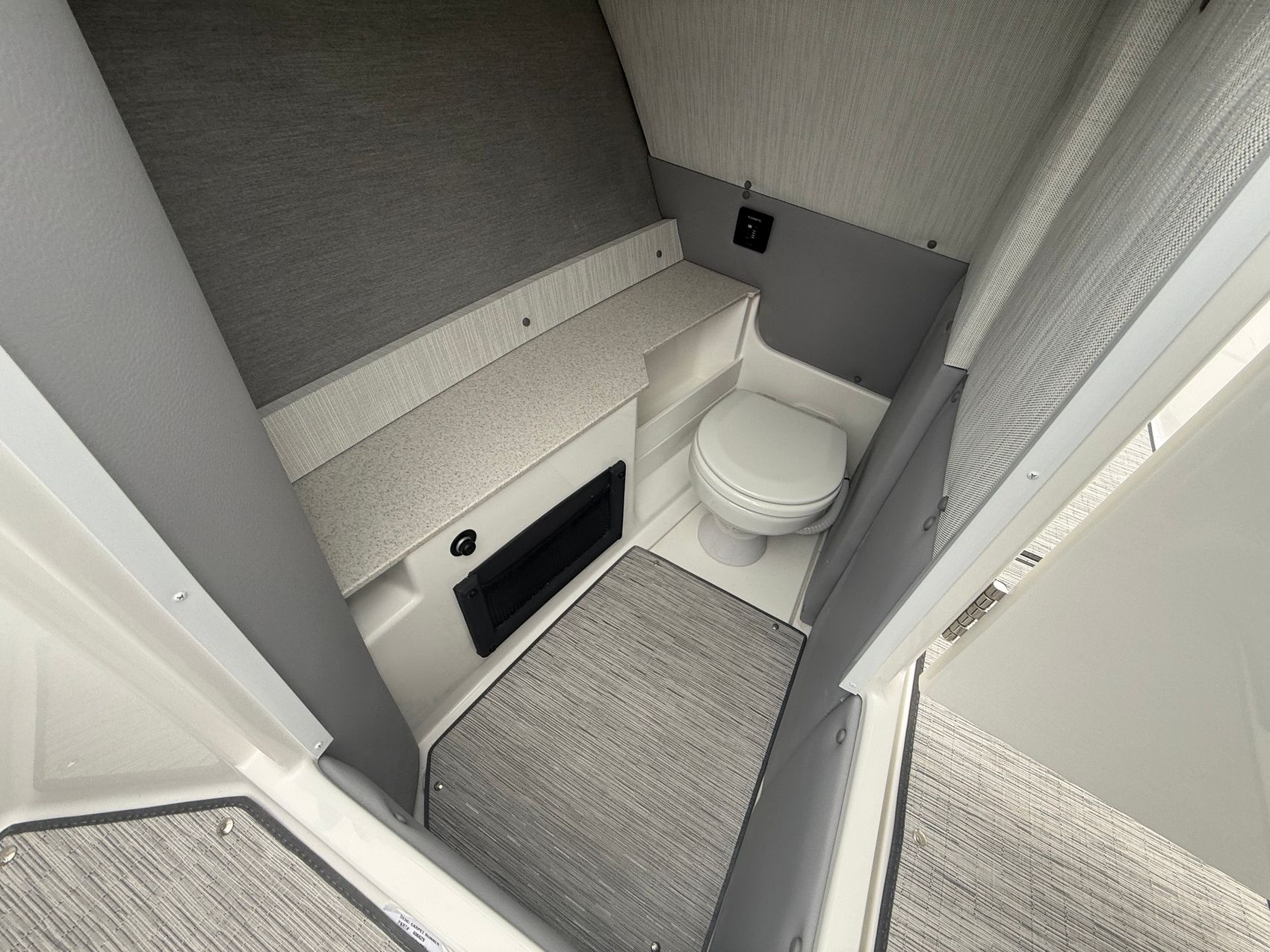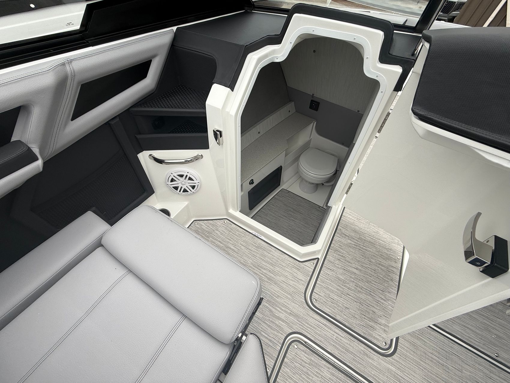 And when it’s time to relax, the experience only gets better. The premium sound system with transom speakers fills the air with rich, immersive audio, while RGB LED interior lighting sets the mood as the sun goes down. Underfoot, seagrass flooring adds both comfort and durability, and the onboard head with electric porcelain toilet ensures all-day convenience for you and your guests.