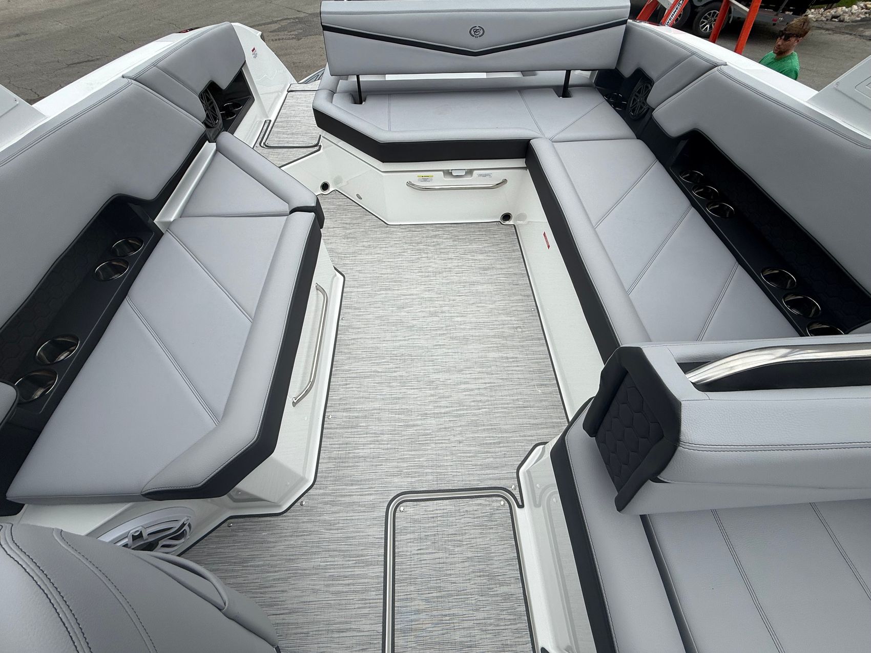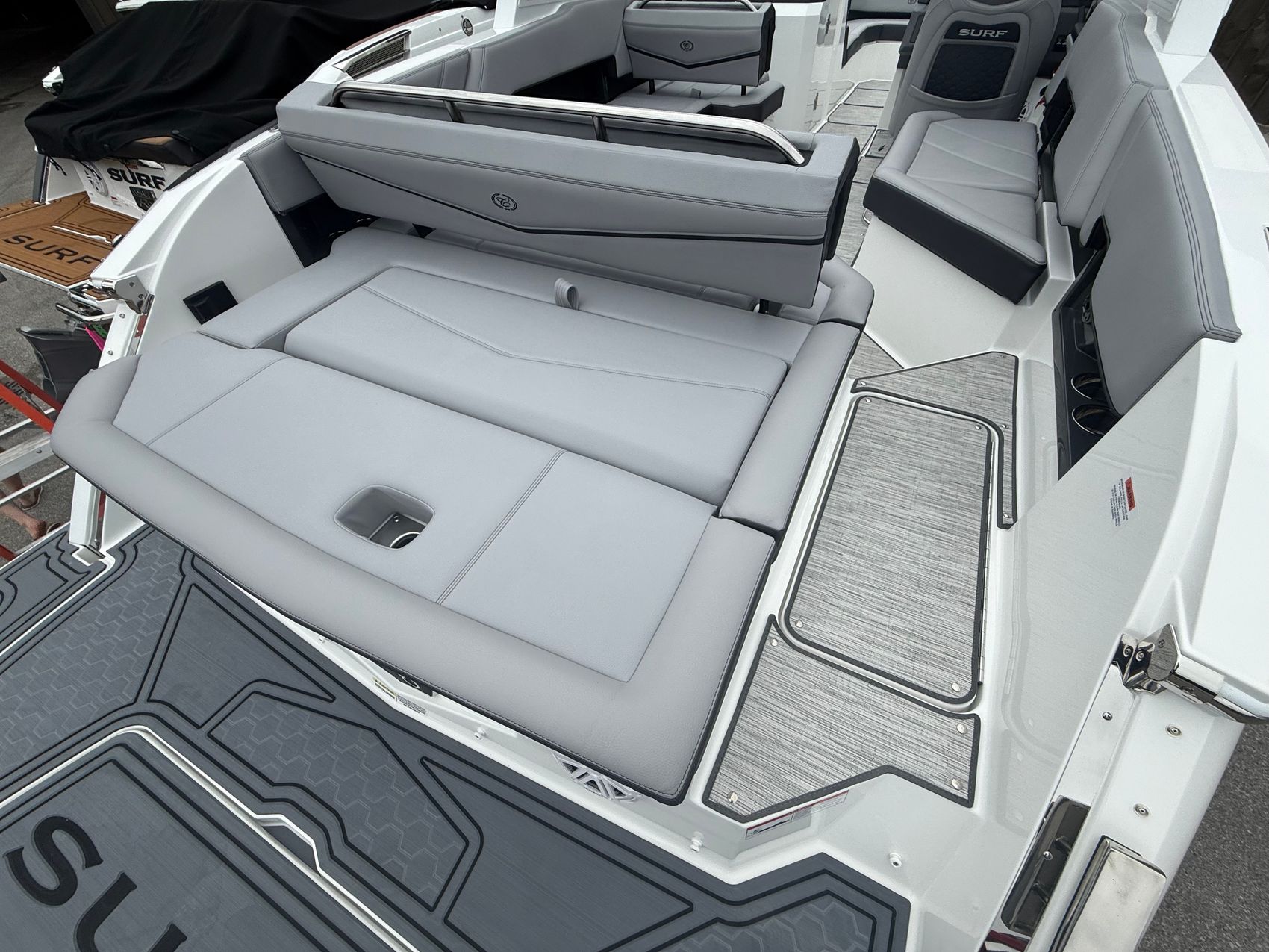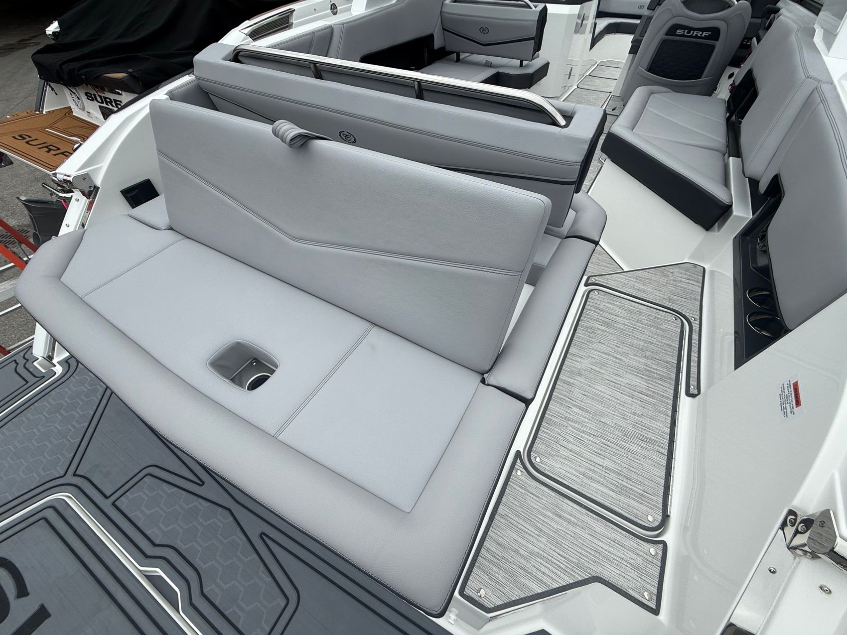 Visually, this boat is nothing short of striking. The Frost/Slate Surf Ebony interior sets a bold, modern tone, complemented by satin black Cobalt lettering and sleek Surf Gate accents that give it a refined, aggressive edge. Overhead, the Prisma electric folding arch with integrated Bimini adds both function and presence—deploying at the touch of a button while elevating the boat’s unmistakable profile.