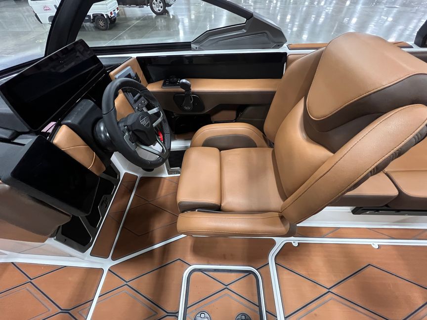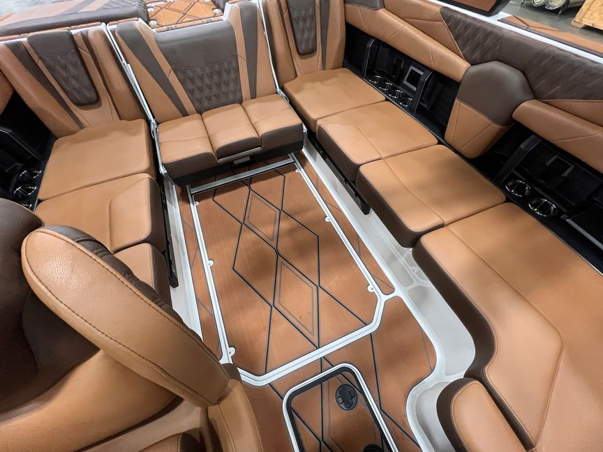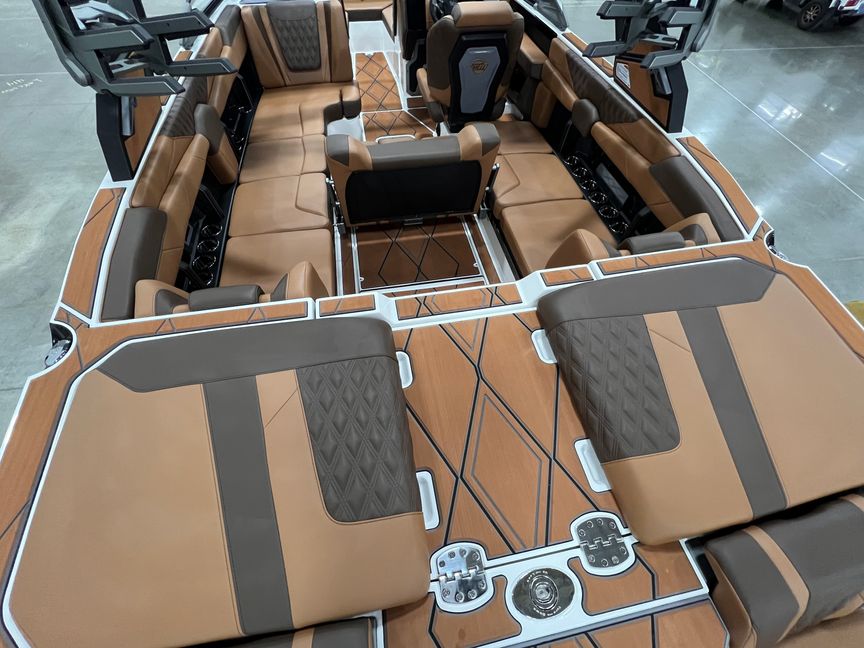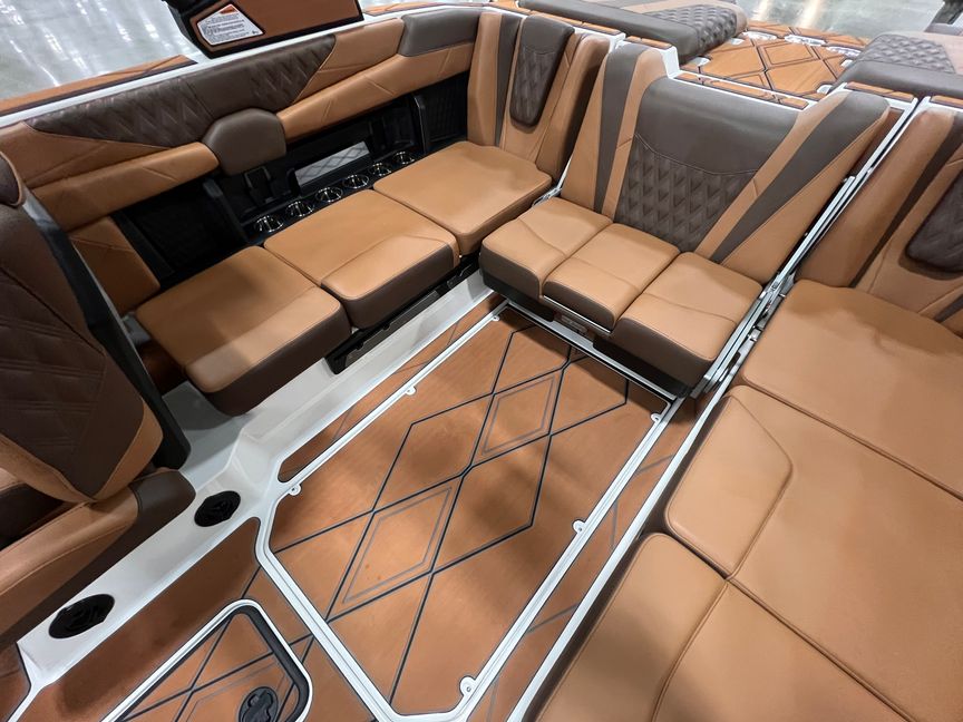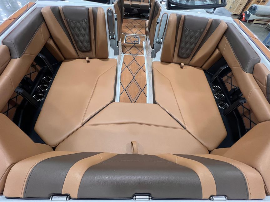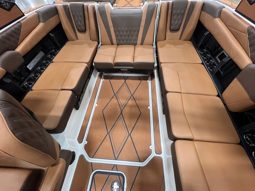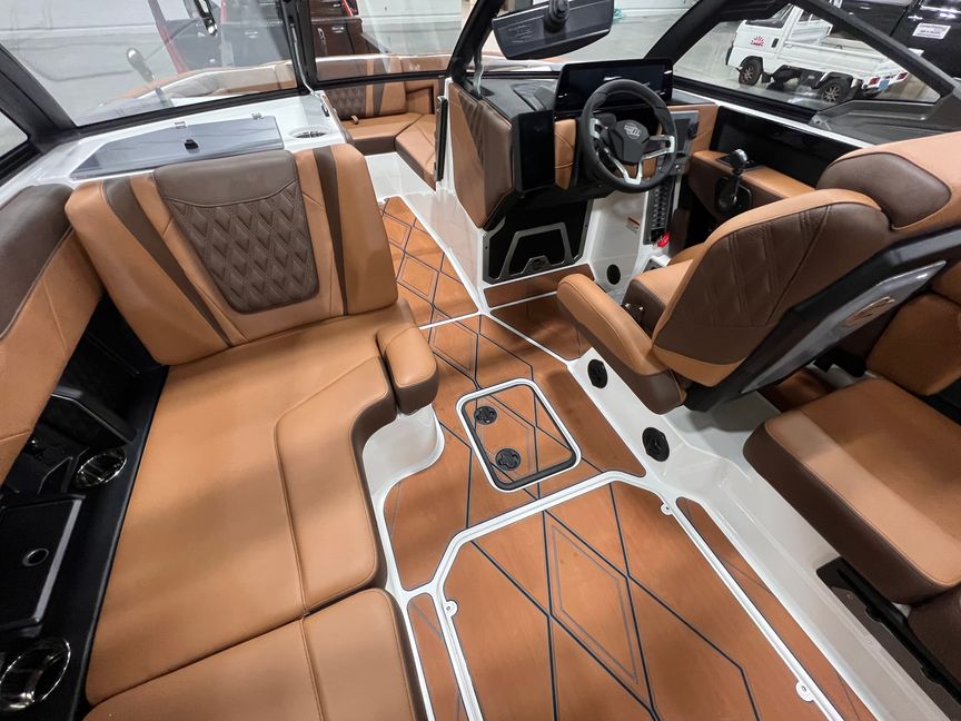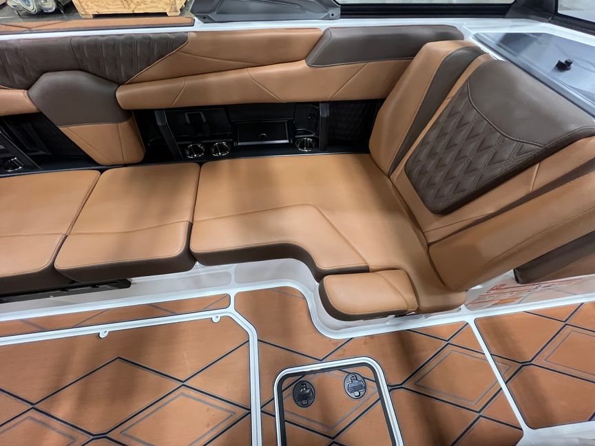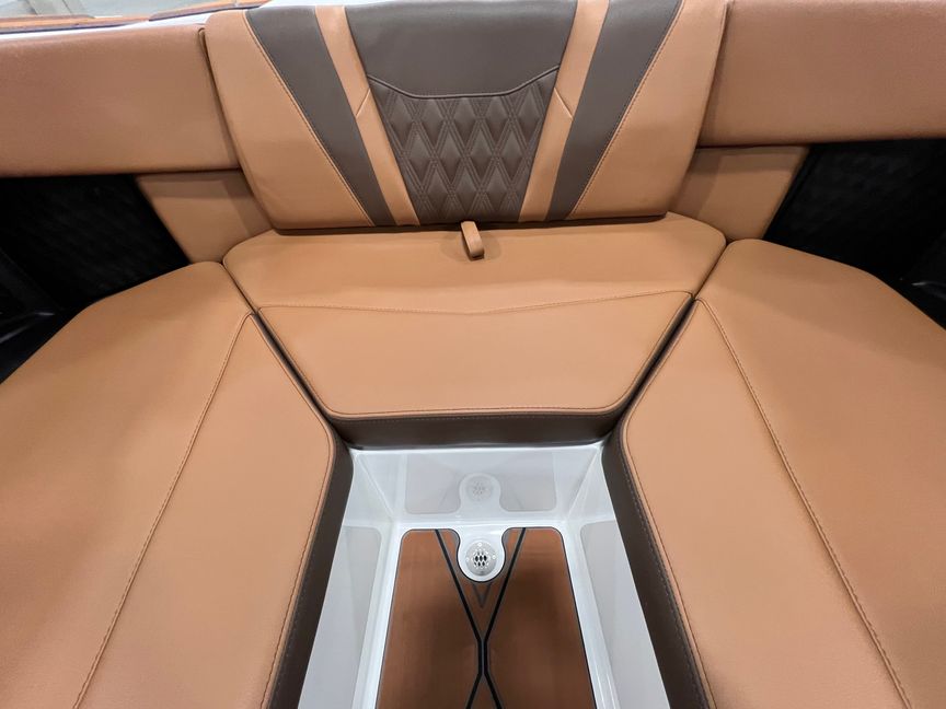 Step inside and you’re surrounded by premium craftsmanship and thoughtful design. The interior is finished in a sophisticated blend of Cool Sepia Brown and Cool Carob Brown, elevated by Sepia accent stitching, soft-grip graphite accents, and plush seating throughout. Features like the MaxPivot Wakeview Bench with integrated table, Max-Relax sundeck loungers, bow filler cushion with lean-back, heated driver’s seat, and soft-grip flooring create a space that’s as comfortable for lounging as it is functional for riding days.