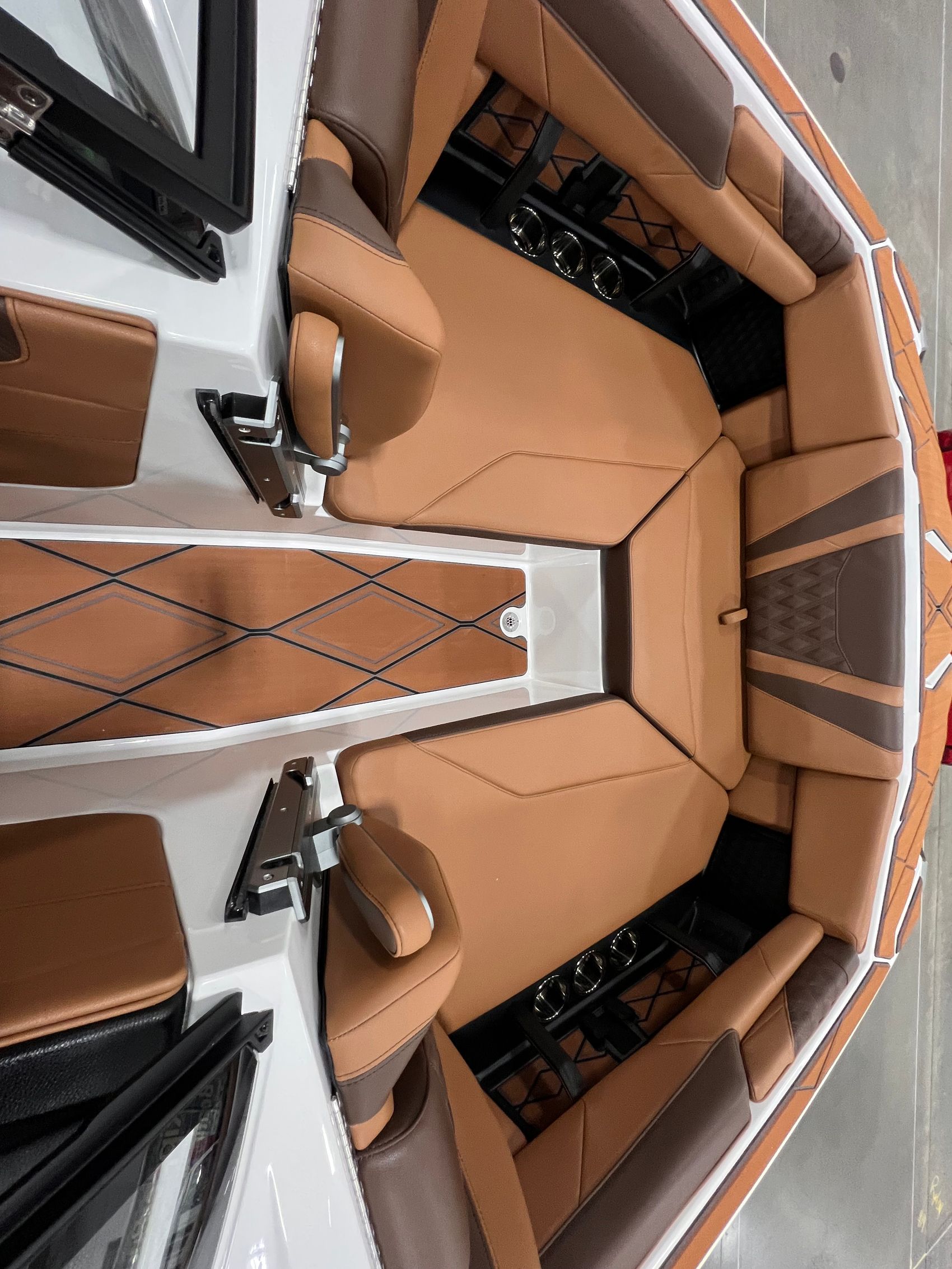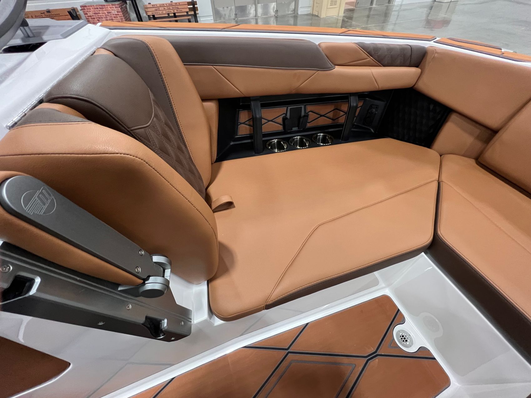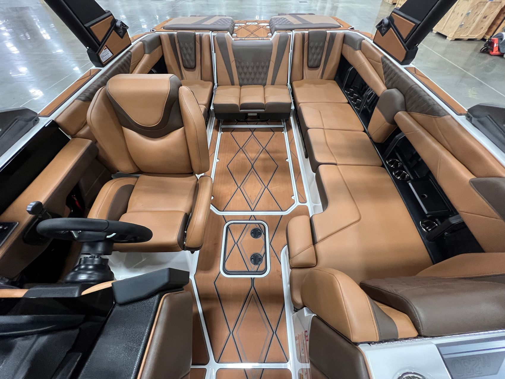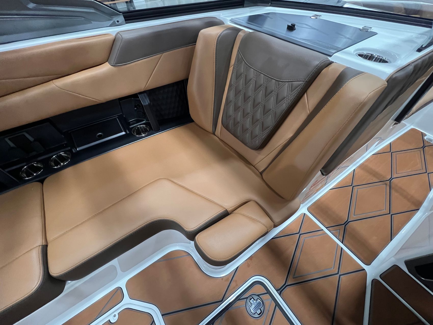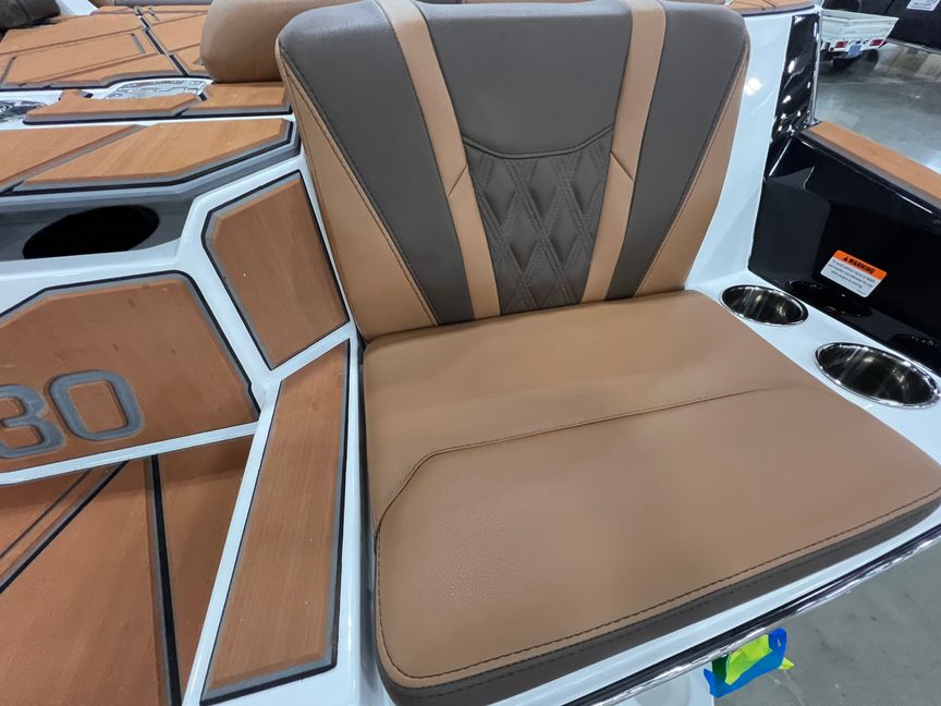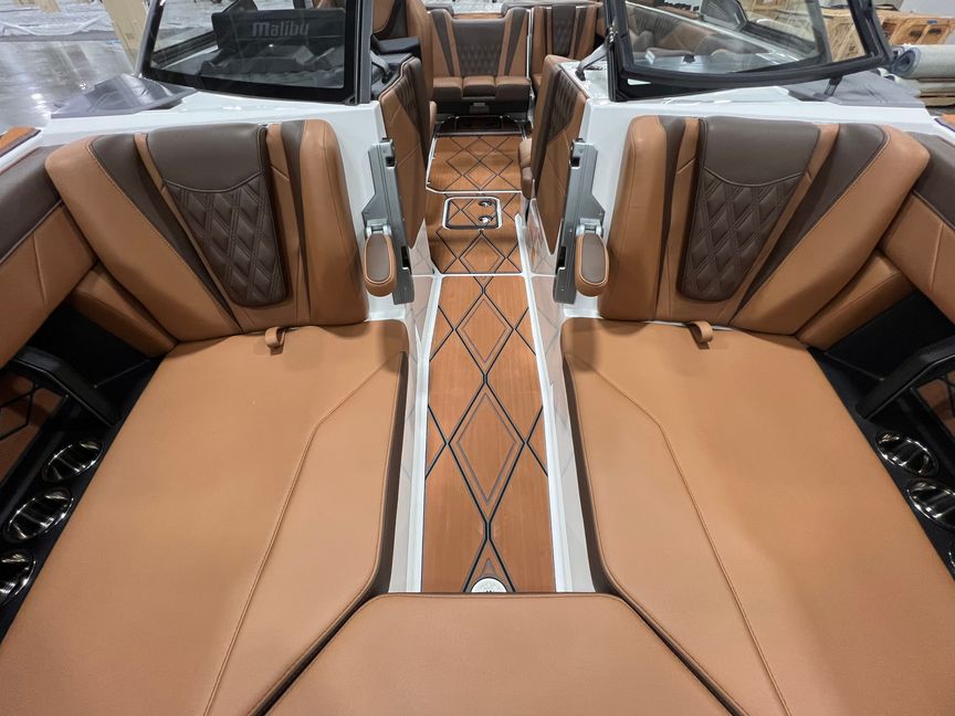 Step inside and you’re surrounded by premium craftsmanship and thoughtful design. The interior is finished in a sophisticated blend of Cool Sepia Brown and Cool Carob Brown, elevated by Sepia accent stitching, soft-grip graphite accents, and plush seating throughout. Features like the MaxPivot Wakeview Bench with integrated table, Max-Relax sundeck loungers, bow filler cushion with lean-back, heated driver’s seat, and soft-grip flooring create a space that’s as comfortable for lounging as it is functional for riding days.