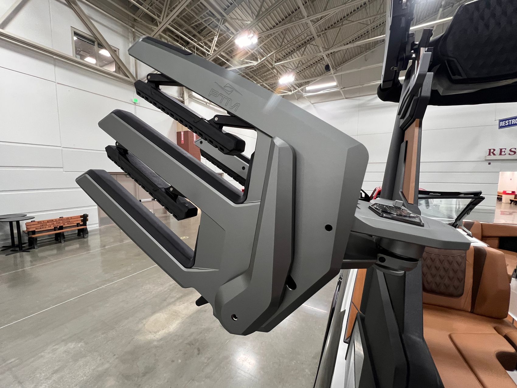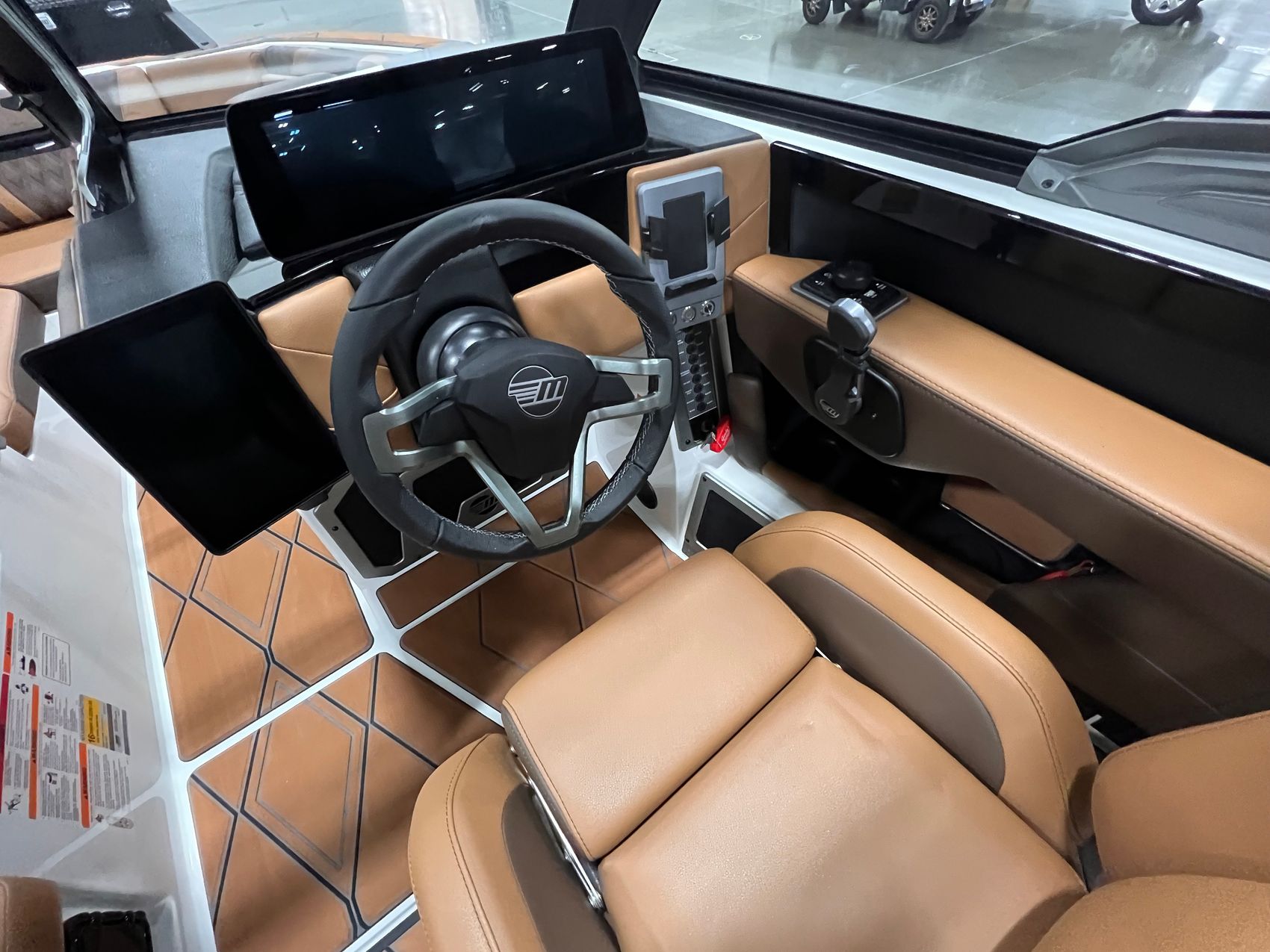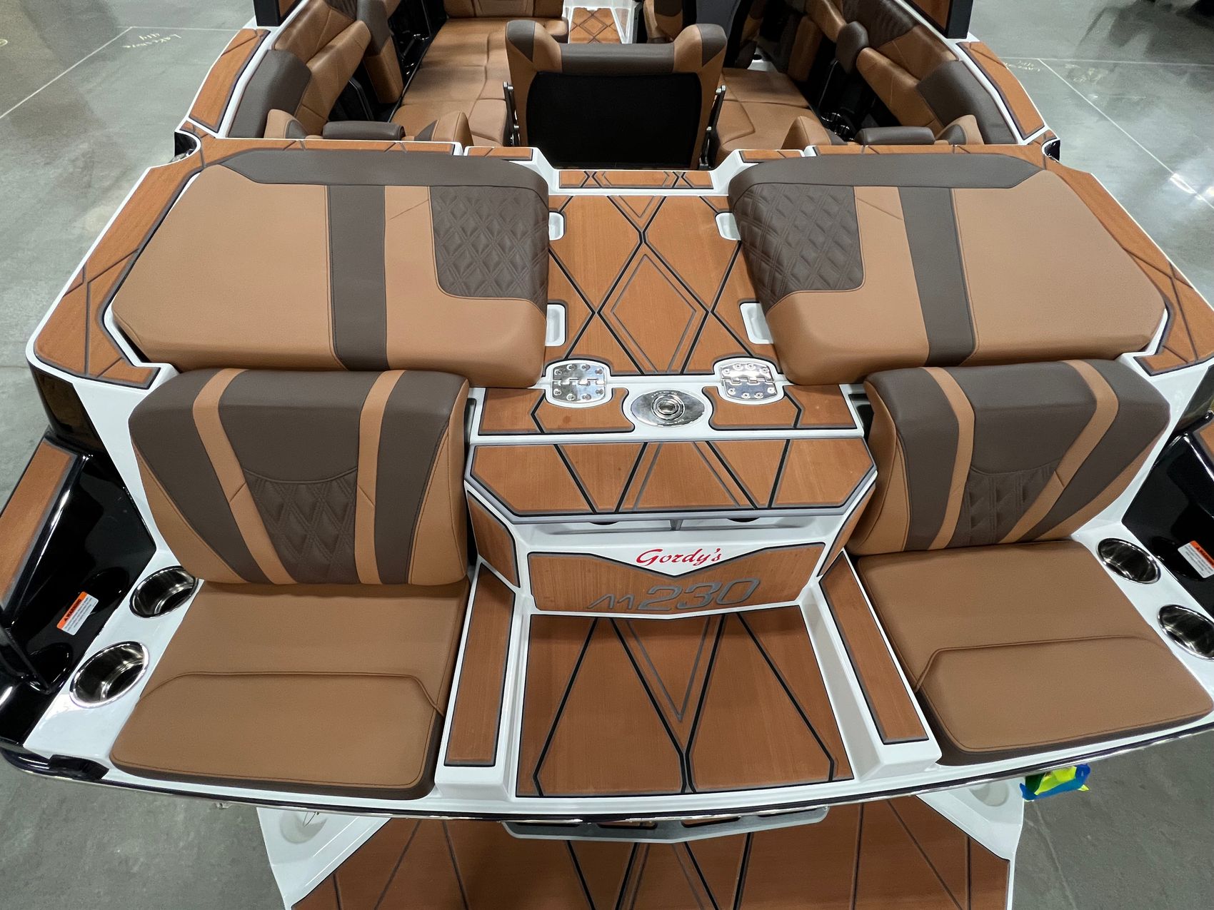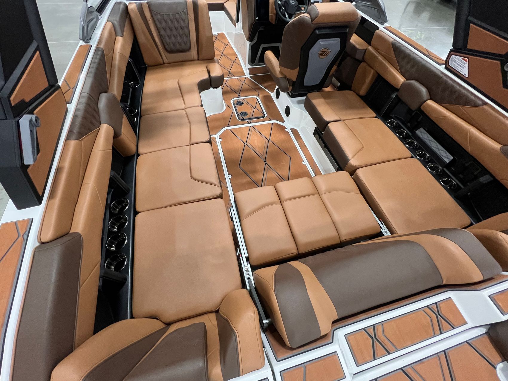 Step inside and you’re surrounded by premium craftsmanship and thoughtful design. The interior is finished in a sophisticated blend of Cool Sepia Brown and Cool Carob Brown, elevated by Sepia accent stitching, soft-grip graphite accents, and plush seating throughout. Features like the MaxPivot Wakeview Bench with integrated table, Max-Relax sundeck loungers, bow filler cushion with lean-back, heated driver’s seat, and soft-grip flooring create a space that’s as comfortable for lounging as it is functional for riding days.