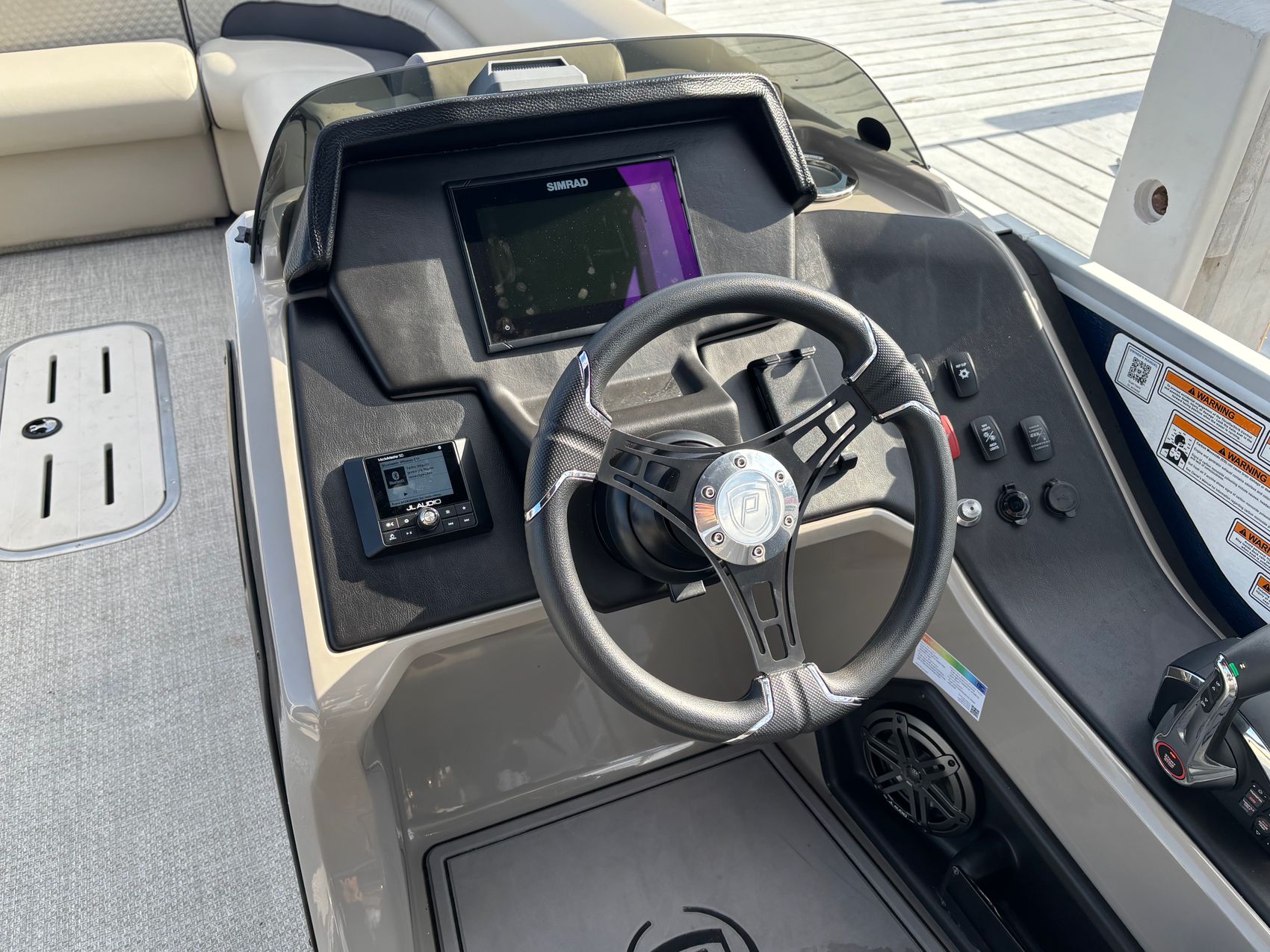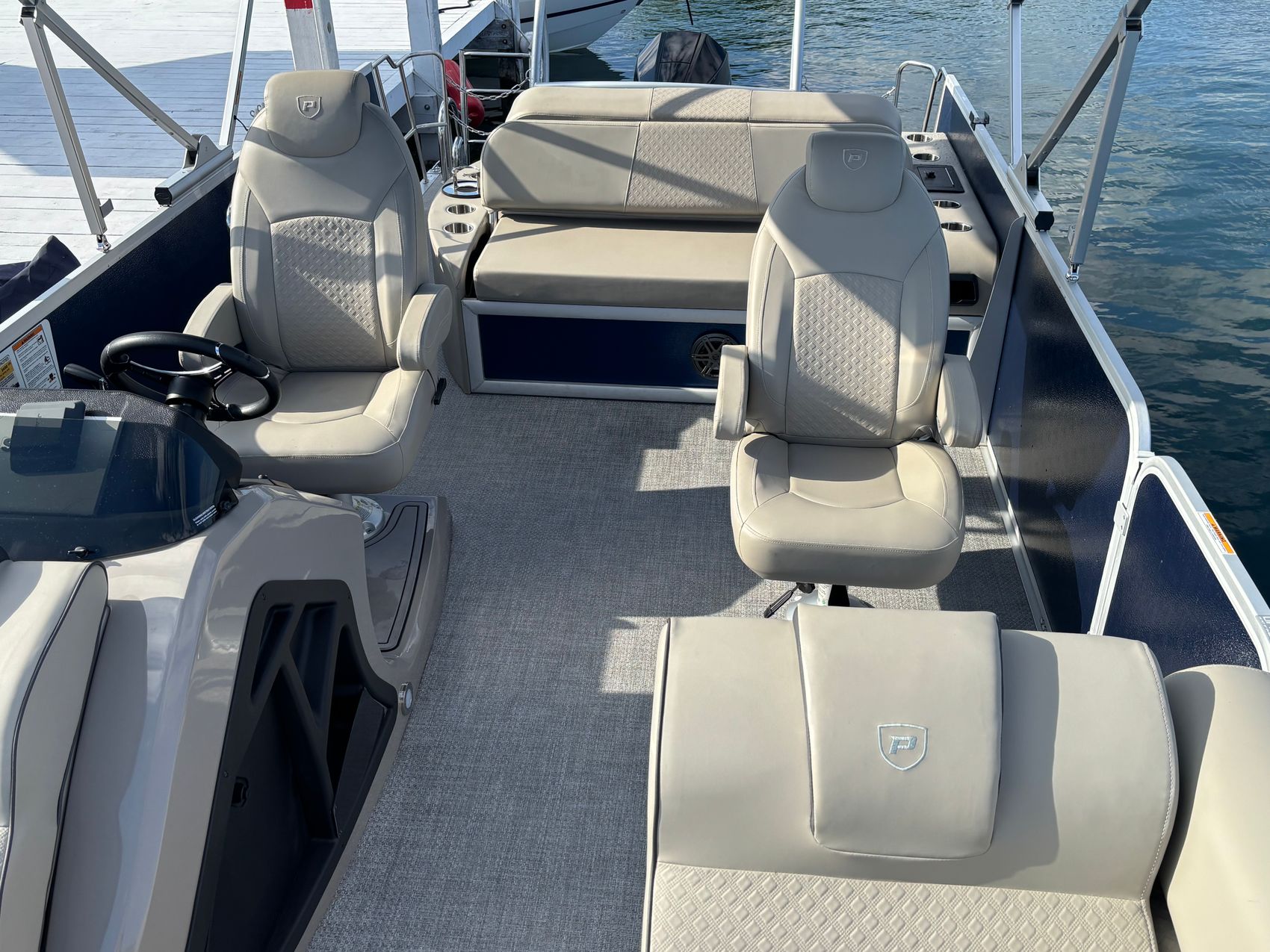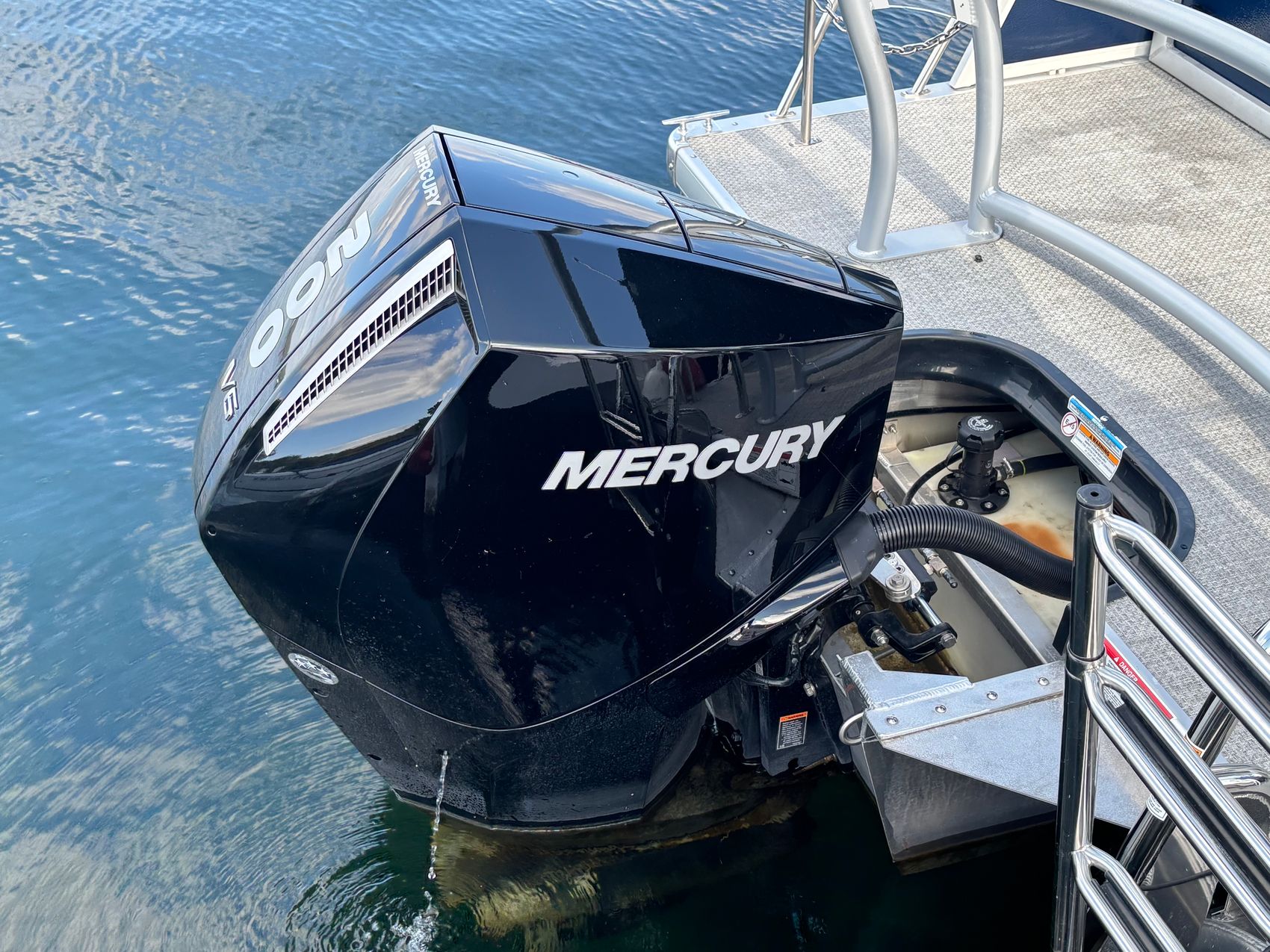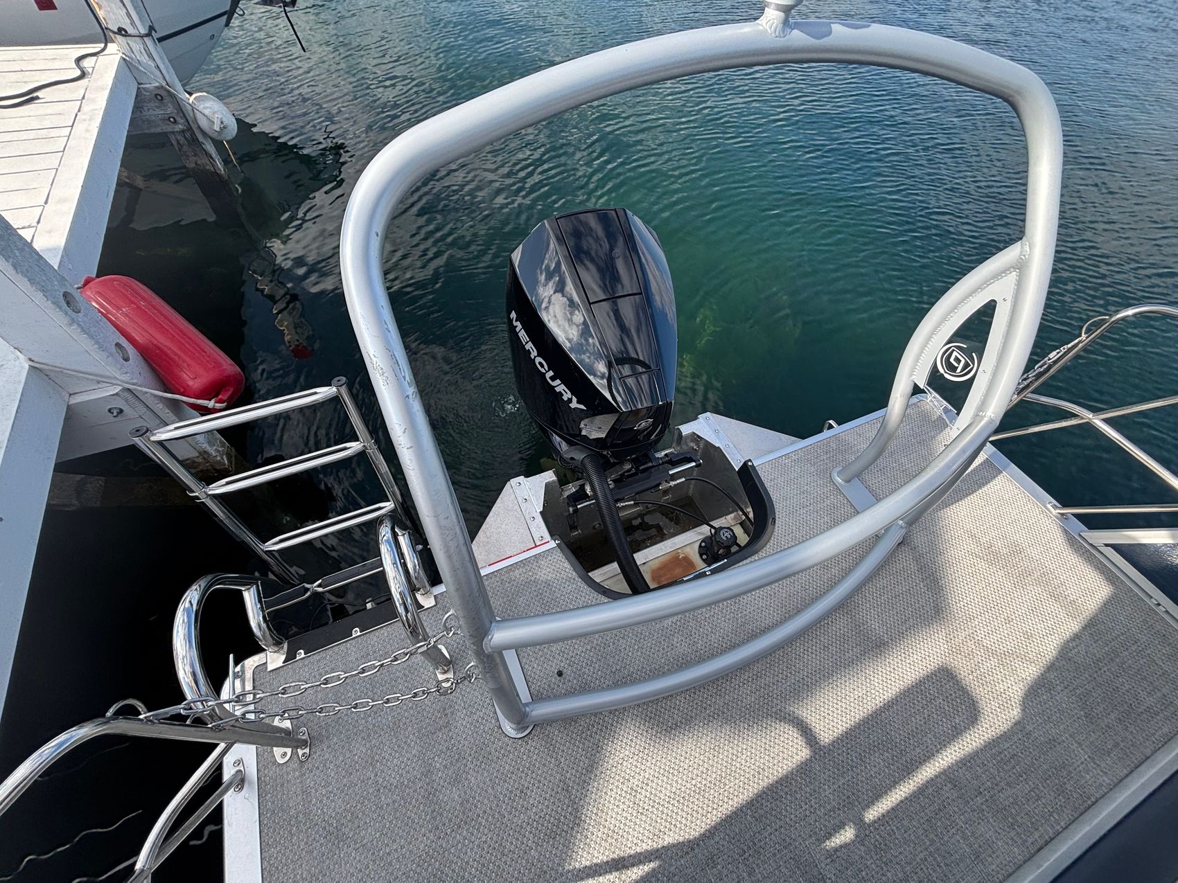 Powered by a Mercury 200L FourStroke DTS 200hp outboard engine, this pontoon is engineered for speed and efficiency, ensuring a smooth and powerful ride every time. And with power steering, you'll have precise control at your fingertips.