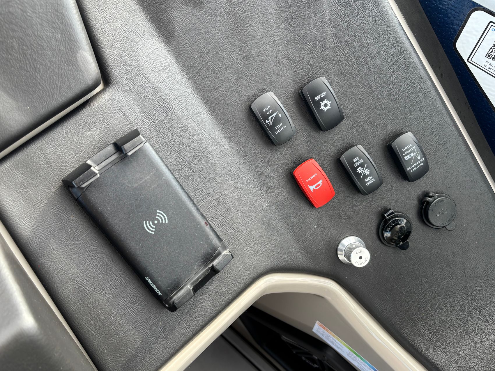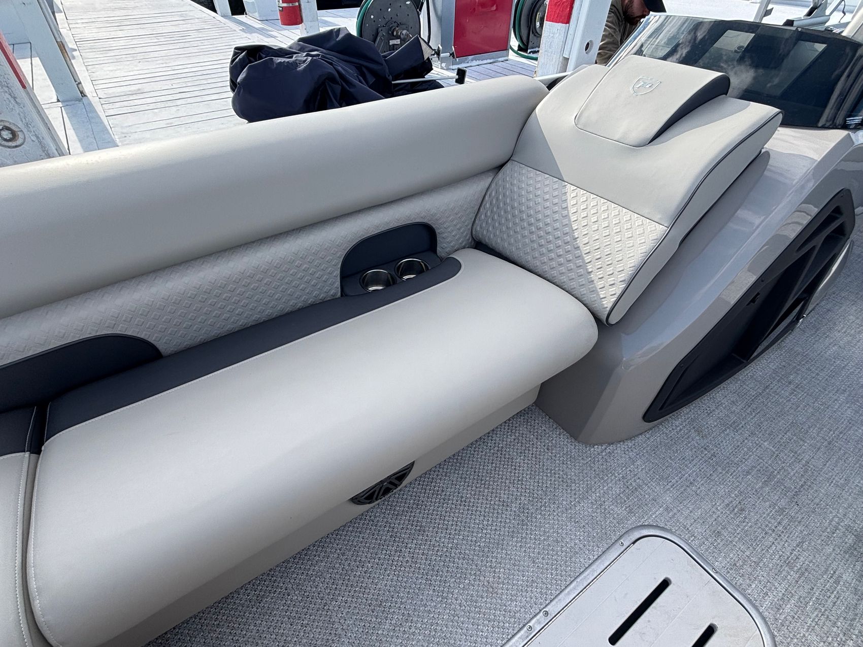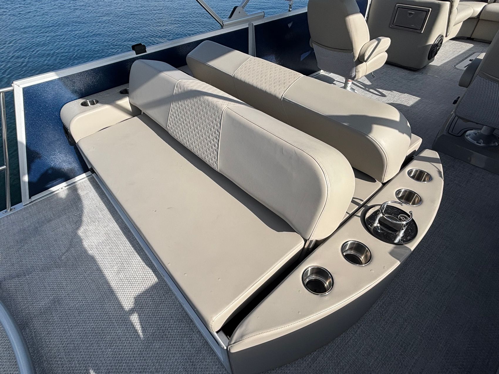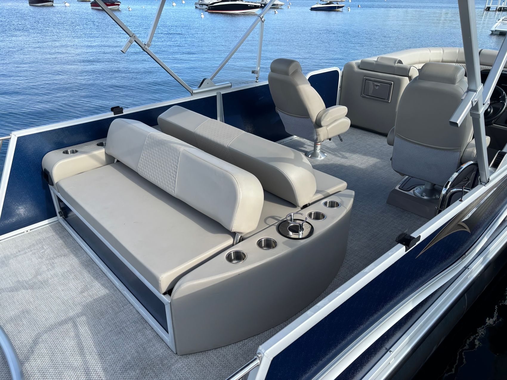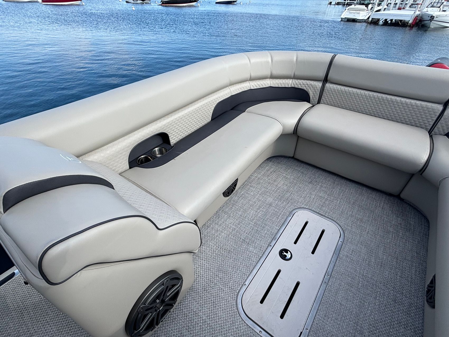 But that's not all - this pontoon is equipped with a range of premium features that set it apart from the competition. The lighted ski tow bar is perfect for water sports enthusiasts, while the RL Stainless gate provides easy access for passengers and gear.