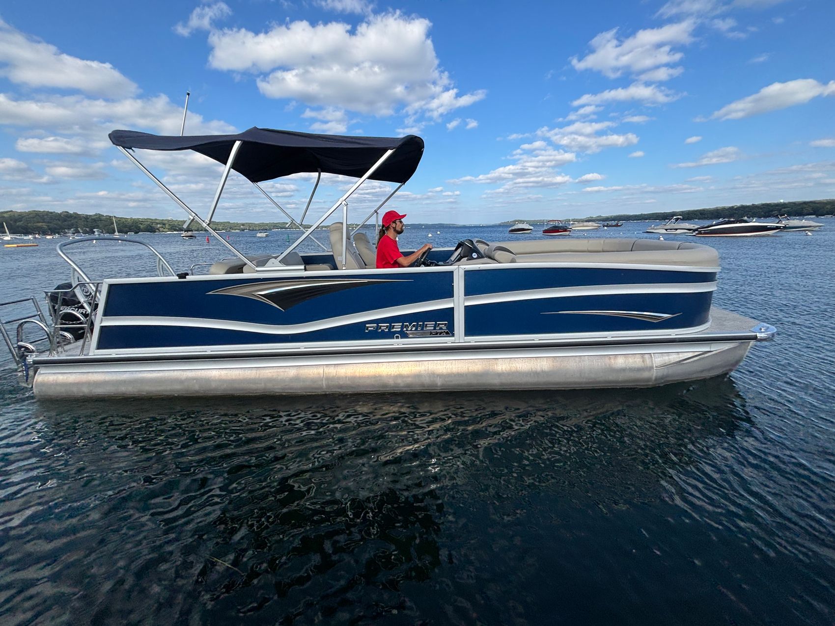 Premier 250 Solaris RL Pontoon! This stunning vessel boasts a sleek Nautical Blue exterior with a spacious bimini top to provide shade on those sunny days out on the water.
