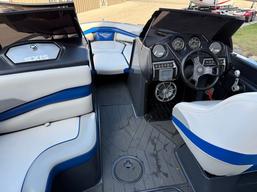 Inside, you’ll find Axis’s signature spacious lounge-style cockpit, wraparound seating, and ample storage for boards and gear. The tower with board racks and speakers keeps everything organized and the energy high, while the helm layout puts total control right at your fingertips.