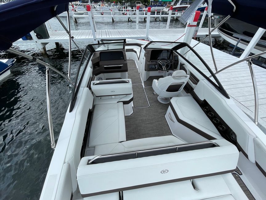 From the moment you step aboard, you’ll notice the attention to detail that defines Cobalt. The Navy and White classic exterior turns heads at the dock, while the Summit and Cocoa interior wraps you in upscale comfort. Every stitch, surface, and curve reflects the brand’s legendary commitment to excellence.