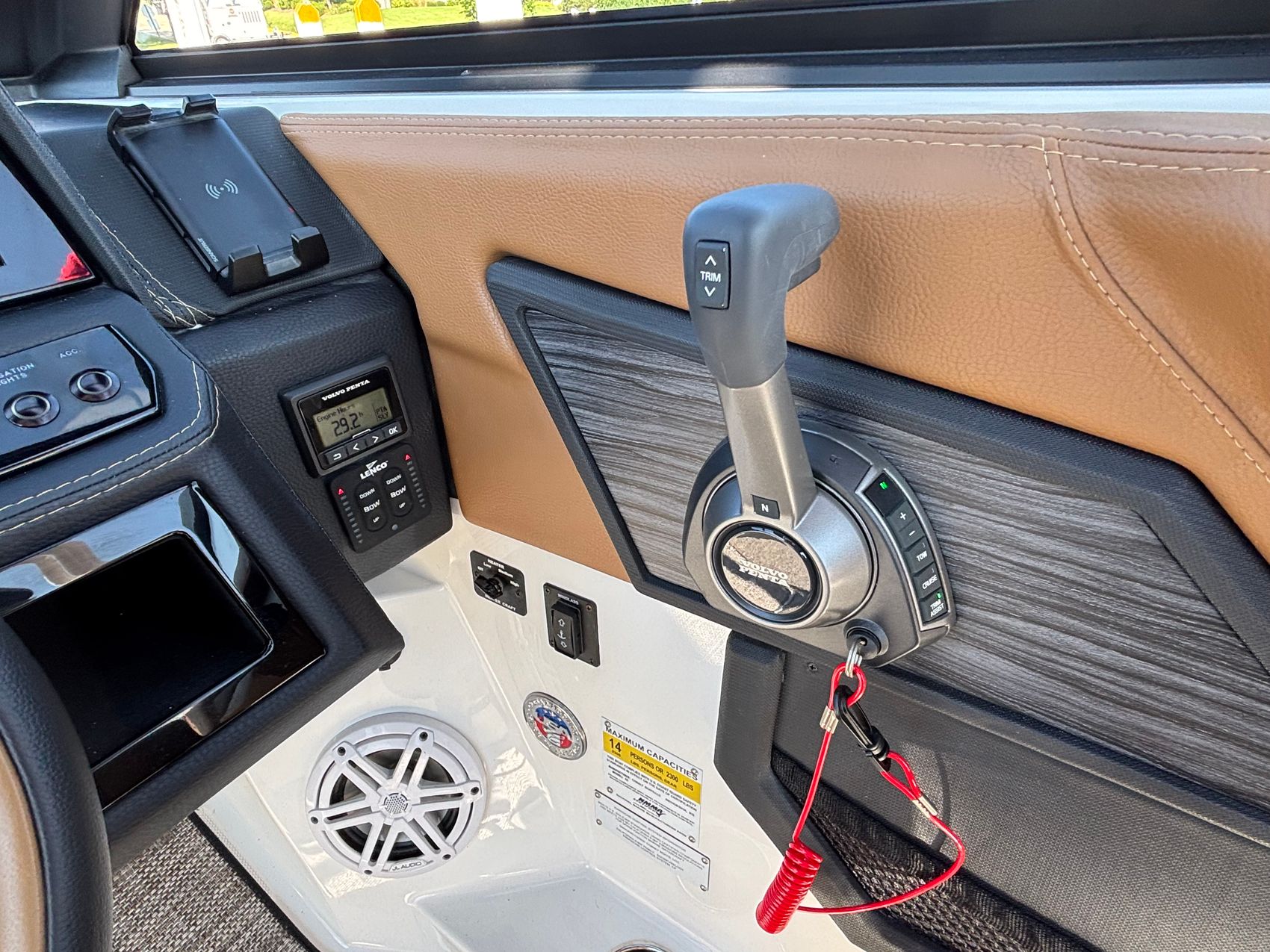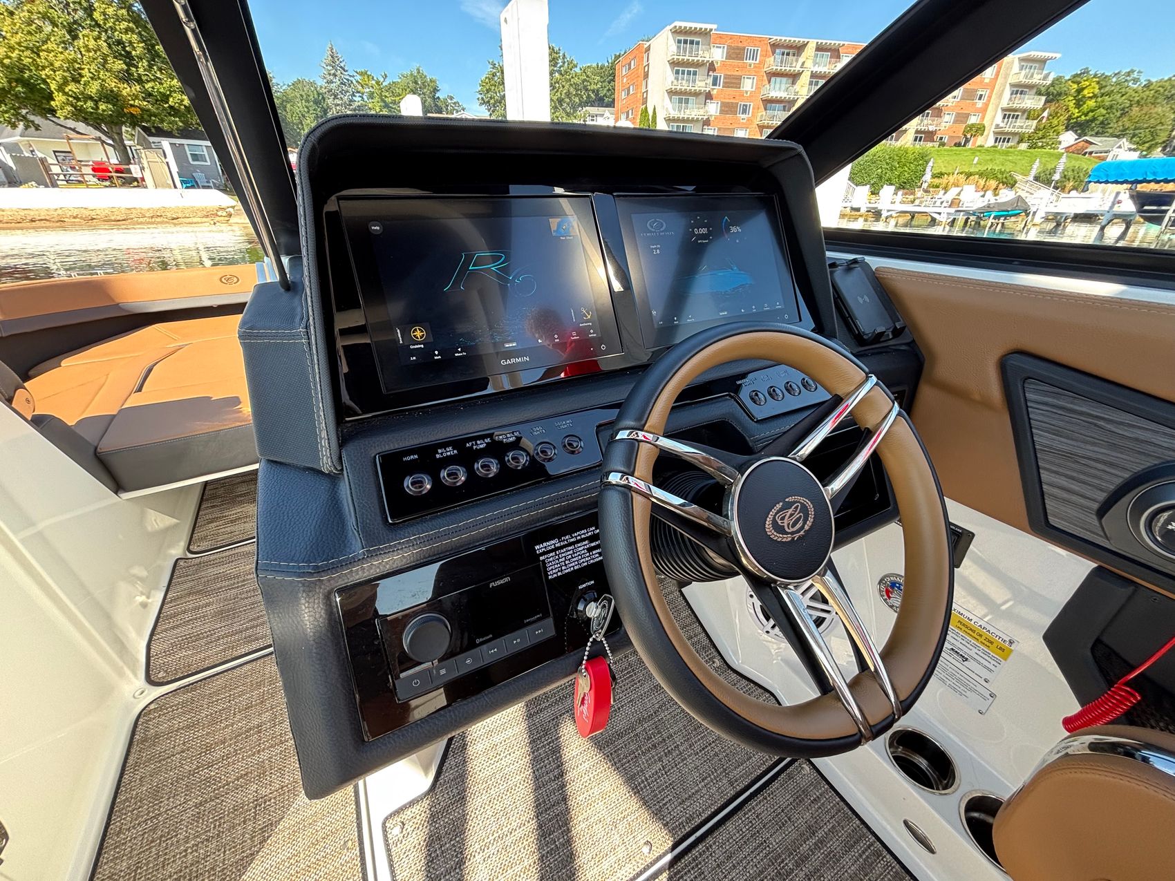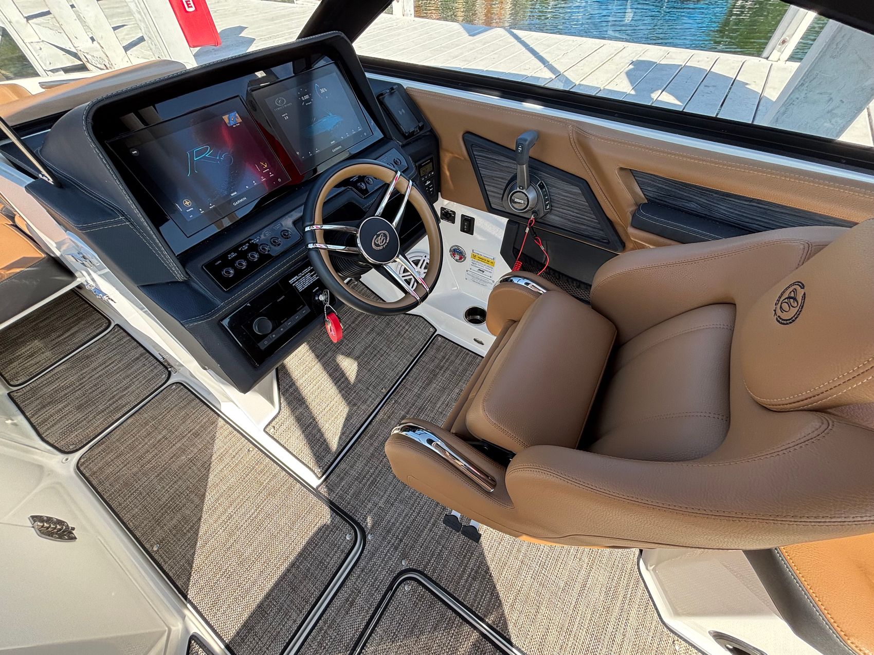 Finished in a Knockout Red, Navy, and White three-tone exterior with swim platform accent, this R6 stands out with unmistakable style. Inside, the Caramel/Carbon interior with wood accents creates an upscale, inviting atmosphere that balances comfort and sophistication.