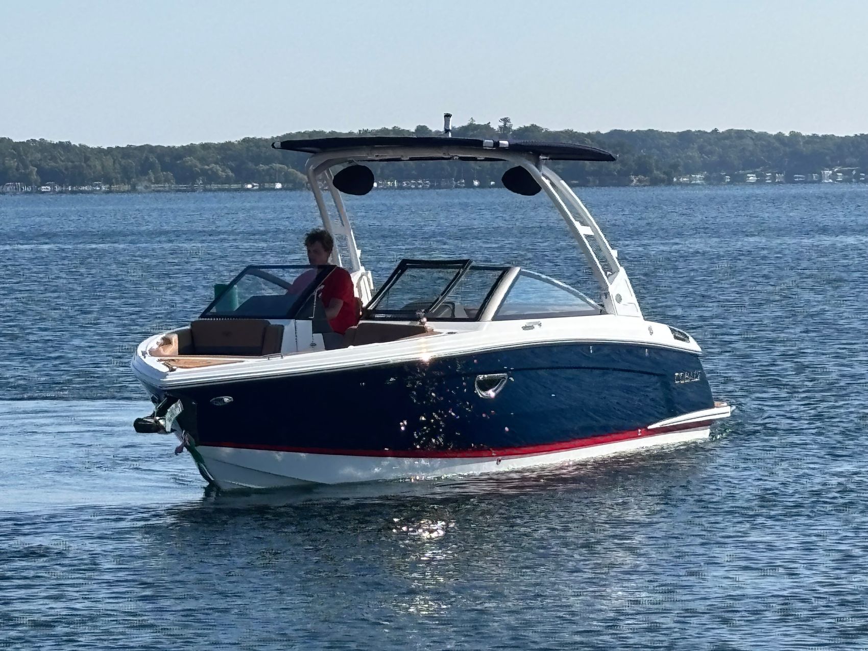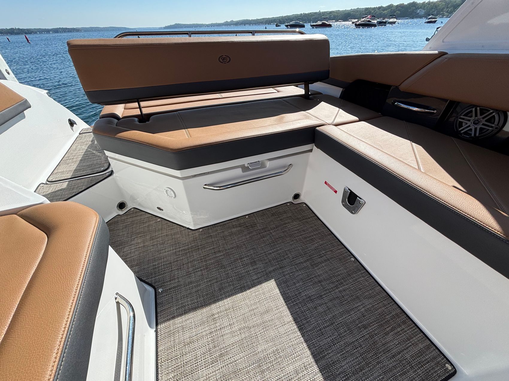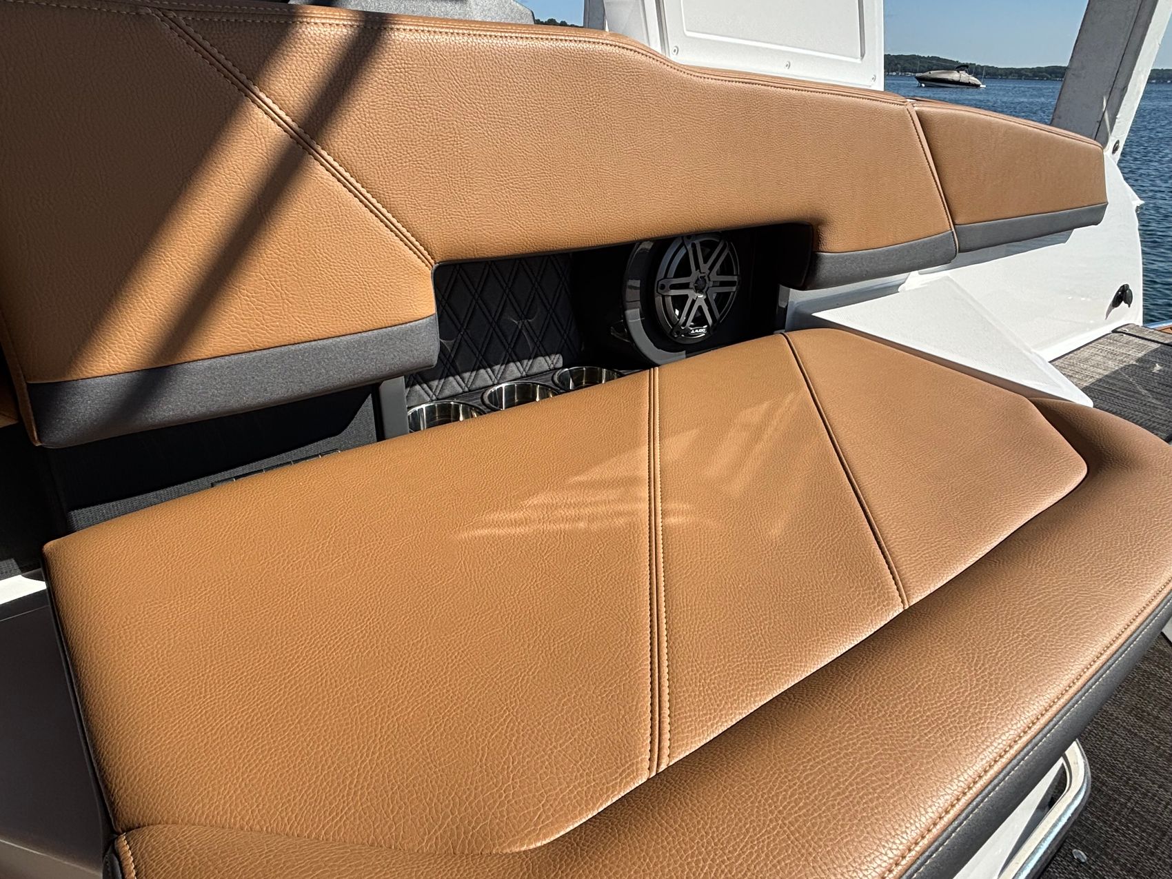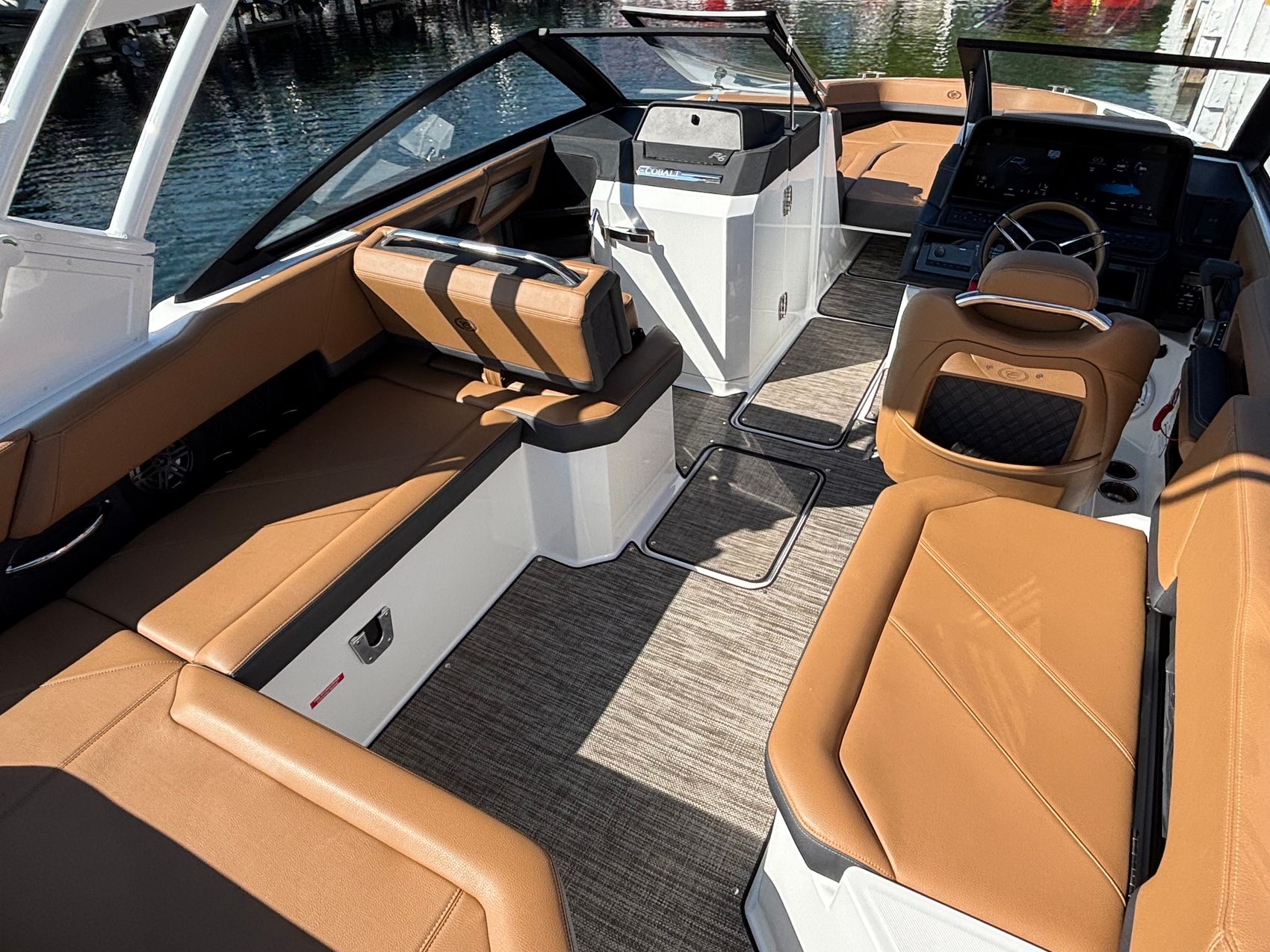 Finished in a Knockout Red, Navy, and White three-tone exterior with swim platform accent, this R6 stands out with unmistakable style. Inside, the Caramel/Carbon interior with wood accents creates an upscale, inviting atmosphere that balances comfort and sophistication.